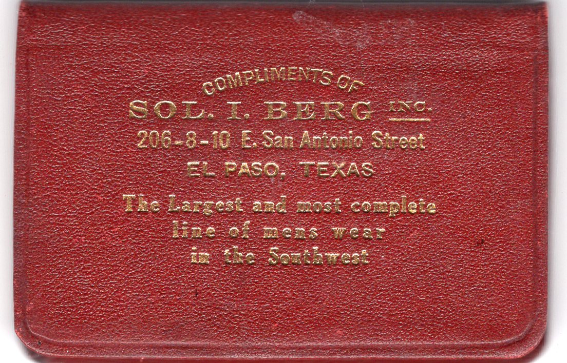 Many of the natty and fashionable men of early twentieth century El Paso patronized the trendsetting clothing shop of Sol I. Berg, Inc. And, during the late 1920s, some of those trendsetters would have received this pocket-sized memorandum book in gratitude for their patronage. This chic yet functional little promo item advertised the fact that Sol I. Berg was a proud retailer of the high-end Schloss Bros. line of men’s clothing.