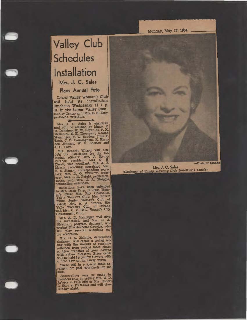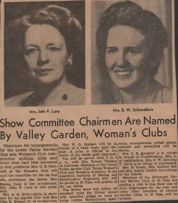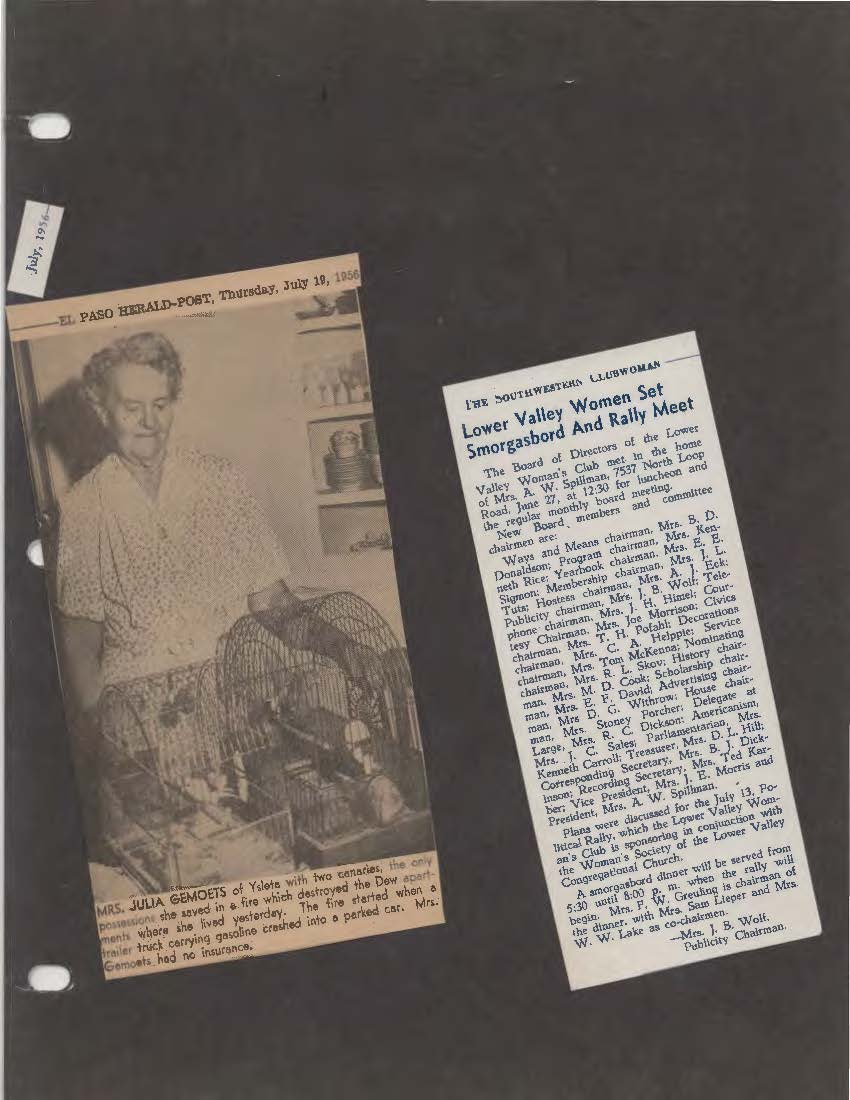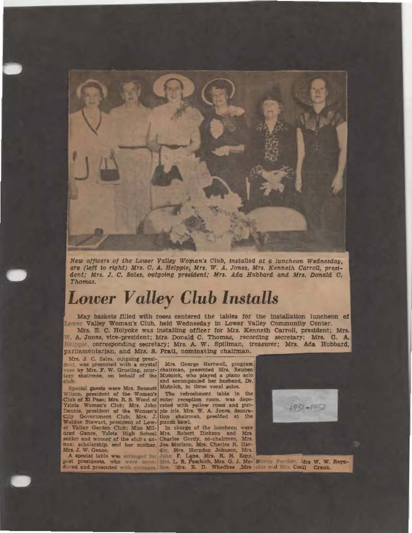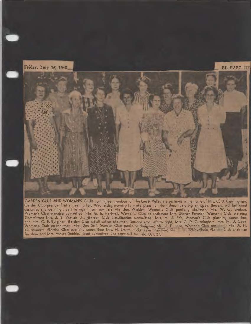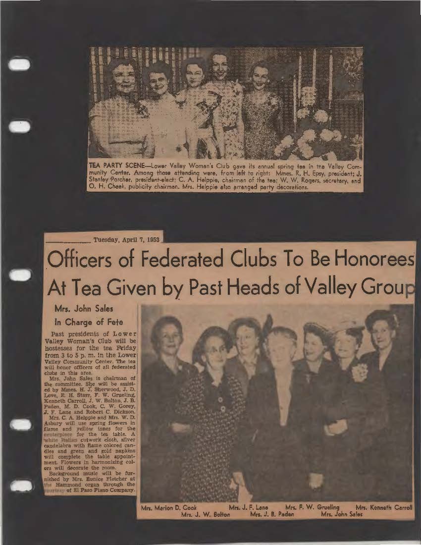 The Lower Valley Woman’s Club was founded in April 1923. The Ysleta Woman’s Community Club was founded at the home of Essie Paden in San Jose, near Ysleta. The Ysleta Woman’s Club wanted a clubhouse and a community center. Jennie Downs was the first president. The community center was dedicated in 1925. The club was renamed the Lower Valley Woman’s Club in the 1930s. These images came out of some of the Lower Valley Woman’s Club scrapbooks and collections at the El Paso County Historical Society.