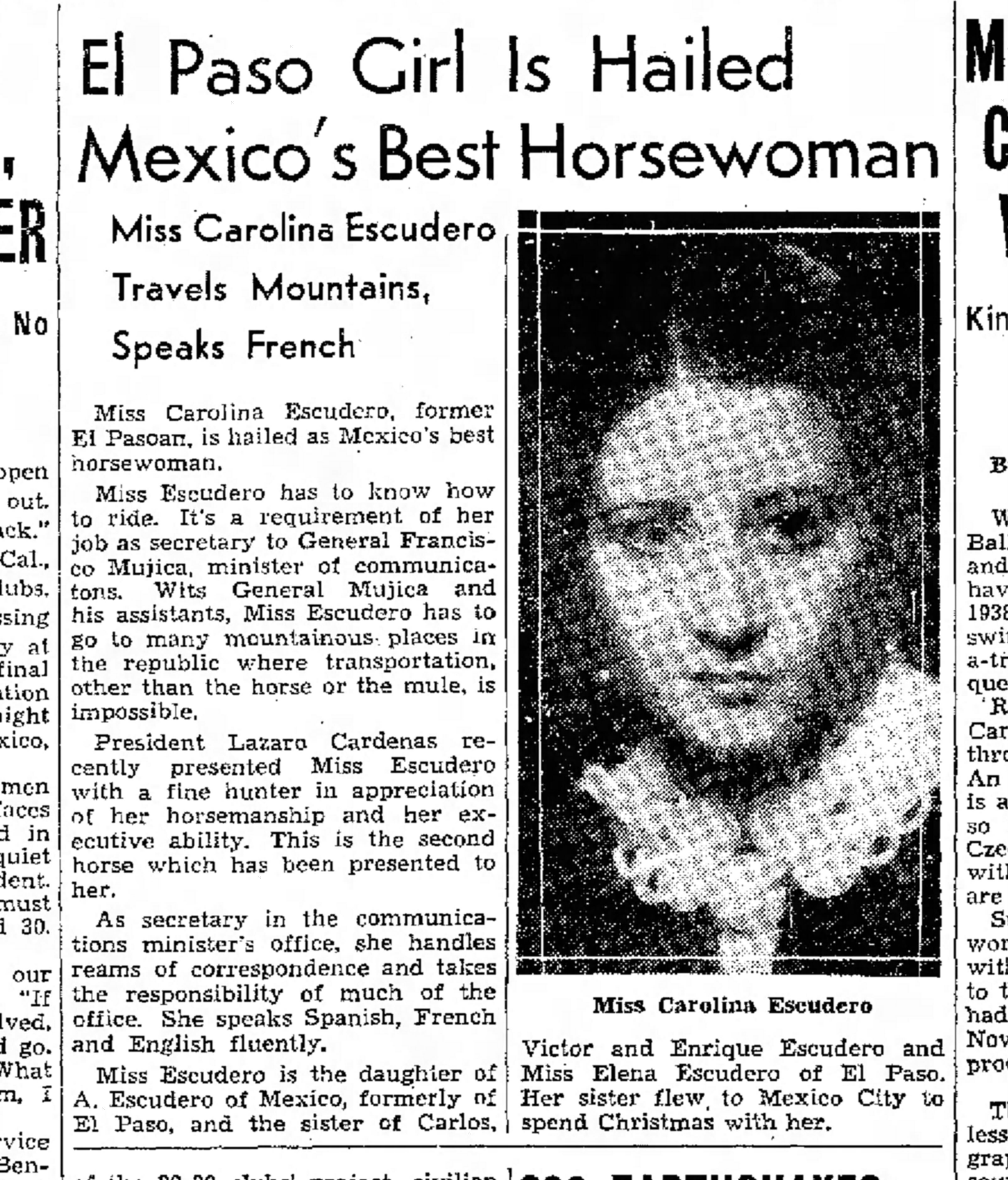 In 1936, a native El Pasoan, Carolina Escudero was named Mexico Best Horsewoman. She was presented with a fine hunter award in appreciation of her horsemanship by Mexican President Lazaro Cardenas. Escudero worked for Mexico’s Minster of Communication dealing with correspondence. She also spoke three languages. Her job involved a lot traveling, in very mountainous regions that you could only get to by horse or mule. ( “El Paso Girl is Hailed Mexico’s Best Horsewoman.” El Paso Herald Post., Jan 3,1938)