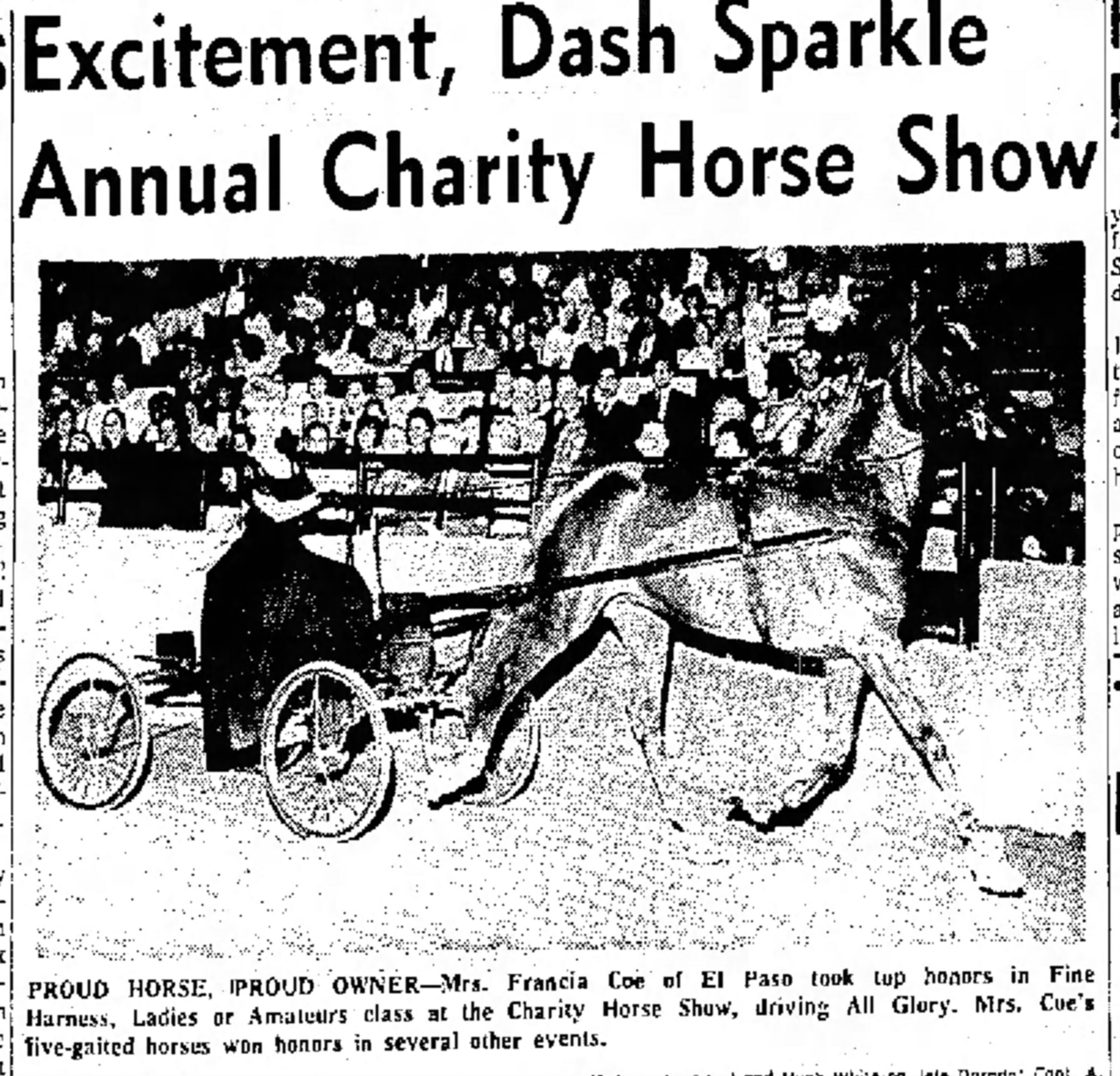 In 1965, Francia Goodwin Coe took top honors in Fine Harness Ladies in the Amateur class at the El Paso Charity Horse Show. Coe was among three generations along with her daughter and mother ,who completed in the horse shows. Goodwin won the first place in the five gaited class and first in the Children’s five gaited class at a Horse show in Ruidoso. In her youth, Coe was a member of the El Paso Junior Driving and Ridding Club. Lelani Greenwood was eighteen when she rode in the 1965, El Paso Horse Charity Show, by that time she won 70 trophies and