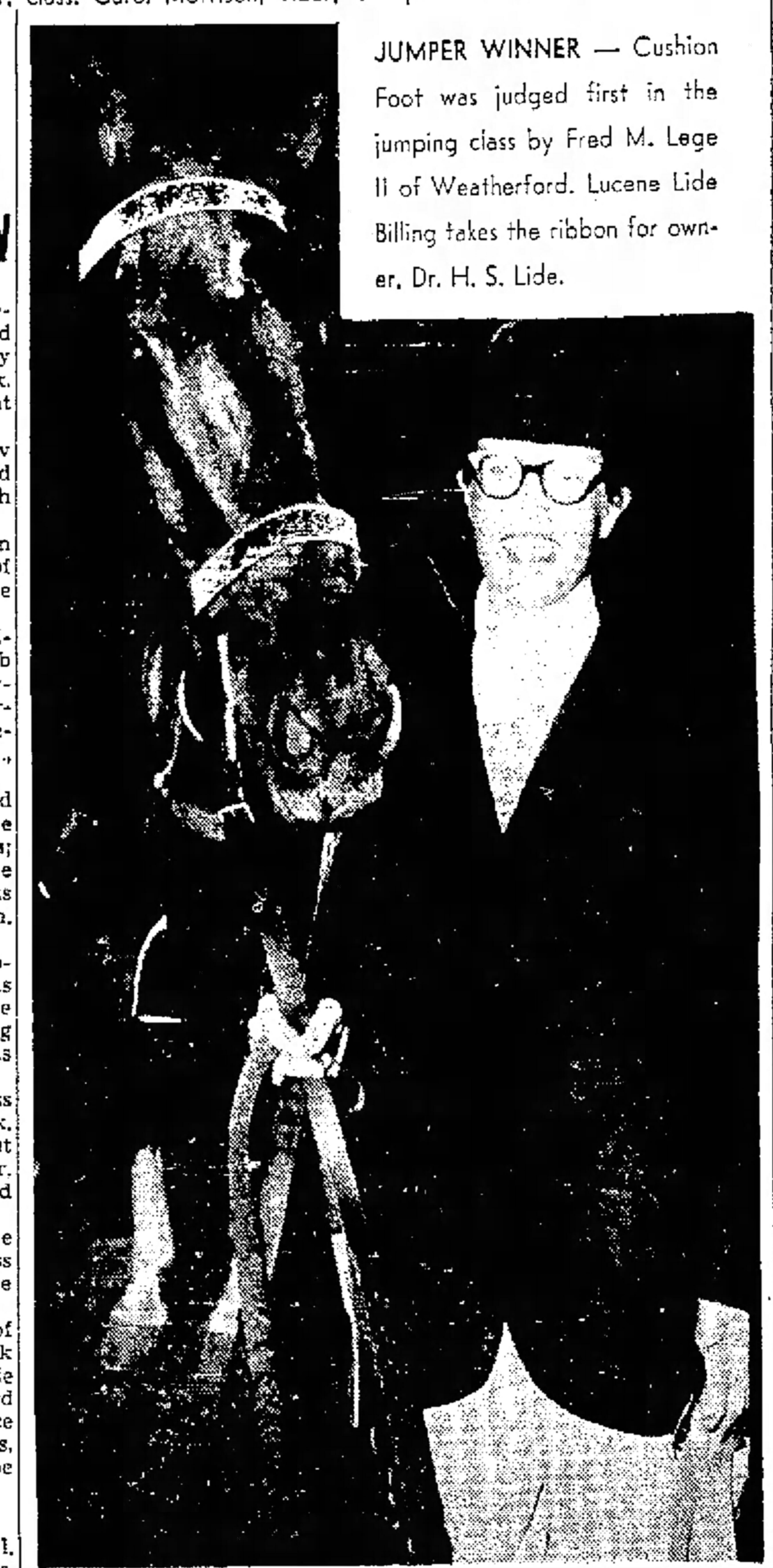 Another woman horse jumper was Lucene Lide Biling. In 1948 she won first place in the jumper class at the Horse Show. In 1951, she advanced to the Texuque Valley Show. Bill