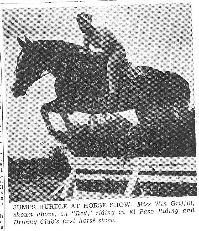 Winalin Griffin rode in show for the El Paso Riding and Driving Club held in 1944 with her horse “Red,” proving herself as a jumper. The first Show was held at the Del Norte Saddlery. Griffin recollected that there was just a dozen members, but By 1953, there were 300 members of the horse riding and driving organization. Griffin did publicity work for the group. Griffin came to El Paso as work assistant for a WPA Recreational Project and to work at a newly organized USO Club in 1947. She headed the Hosiery, Cosmetics, and Lingerie Department at the White House Department Store.