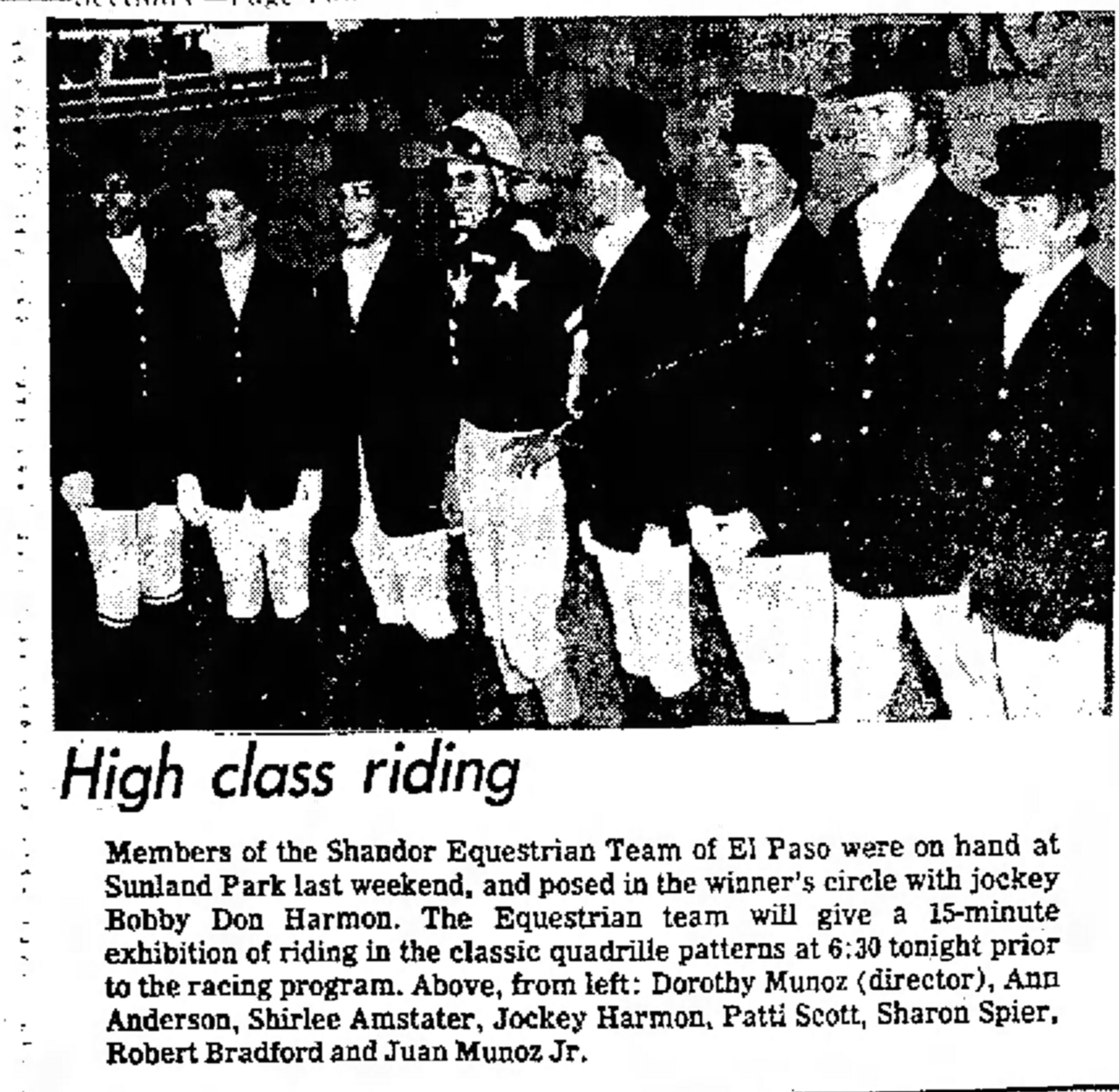 Amstater was a member of the Shandor Equestrian Team of El Paso, founded by Juan Munoz and his wife, Dorothy. They created the organization with 12 men and women to perform “Quadrille” and they would frequently perform at the Sunland Park Race Track. The Munoz trained under Joaquin Chagoya, a prominent Mexican horseman and chief of the Mexican Calvary. Quadrille riders are dress in a special kind of outfit or uniform, the ride is choreographed and it is usually accompanied by music. It is called an equestrian ballet or drill team