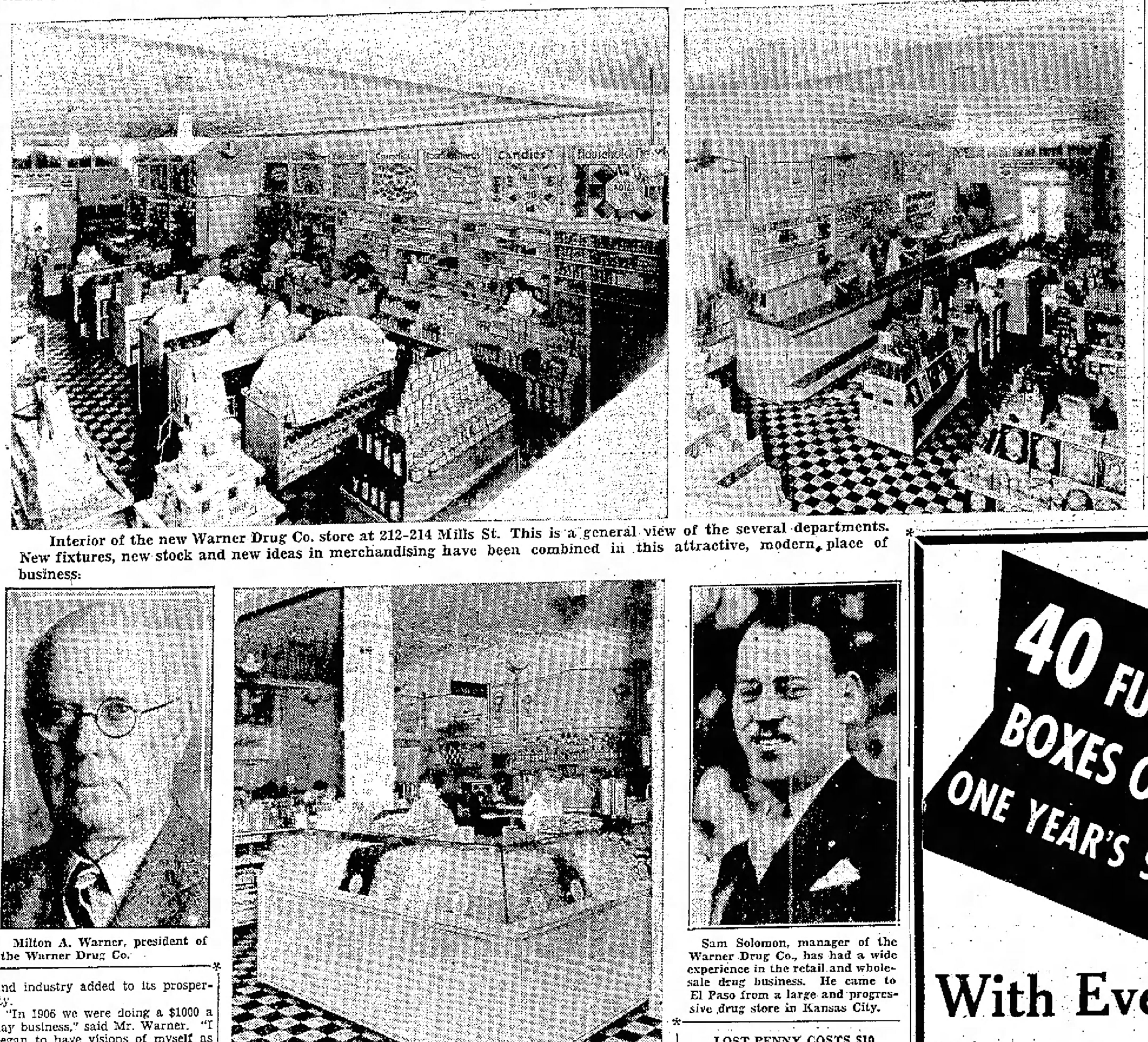 Warner’s first store was opened at 212 Mills street. A fire damage the store in 1935 but the store was rebuilt. It was a pharmacy but also included a soda fountain, watch repair services, and sold cigars. Warner died in El Paso in 1940. His store was taken over by his wife, Jennie. After her death Warner left the company stock to her employees. Warner Pharmacy continued with leadership of Clara Aguirre and her brother. They opened a Warner pharmacy at Tigua Shopping Center in 1955. Warner Pharmacy was closed after 1963.