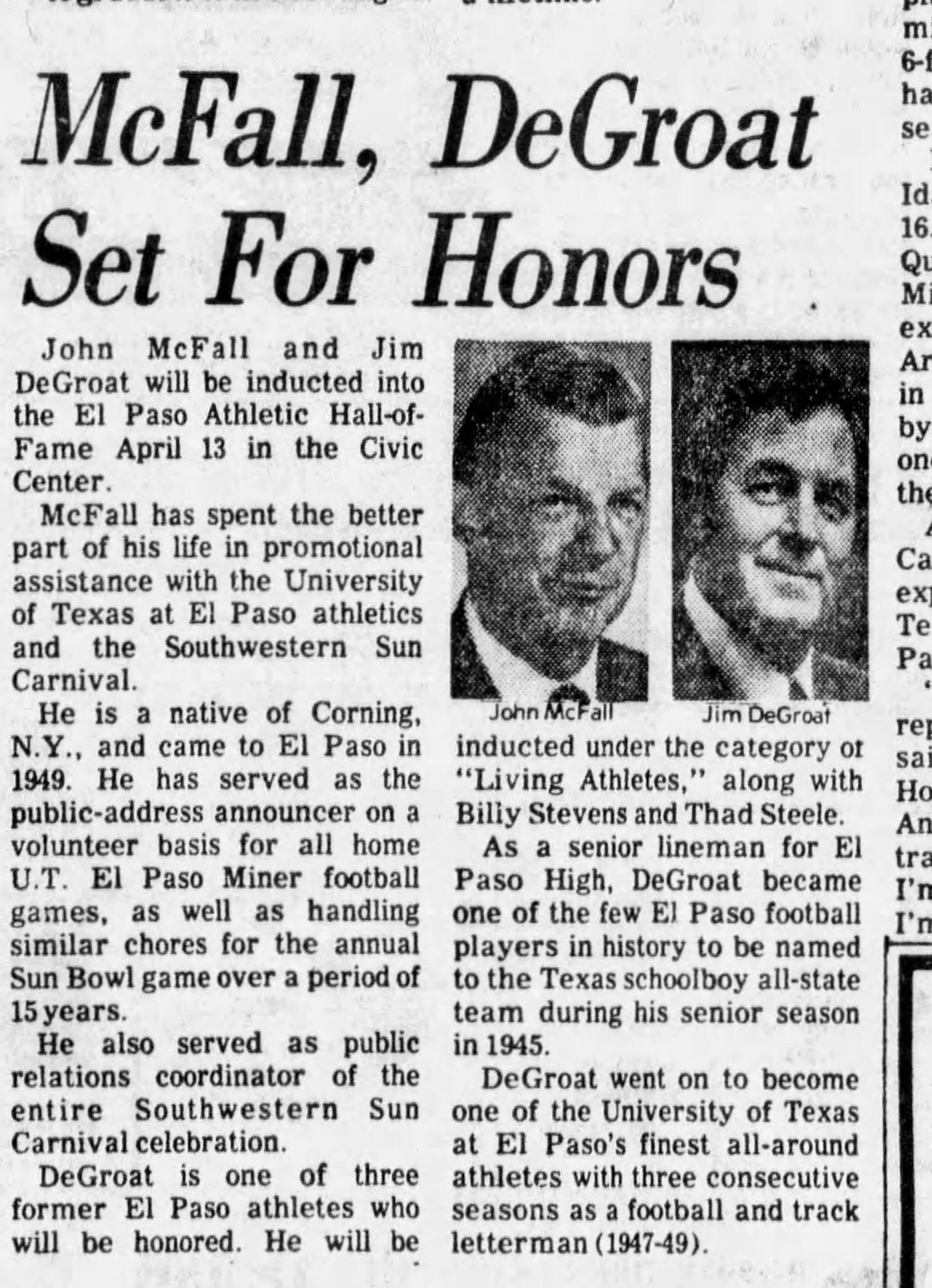 - 1976-Jim Degroat, Senior Lineman for El Paso High’s Football Team. He also was named the to the Texas schoolboy all- state team in 1945.