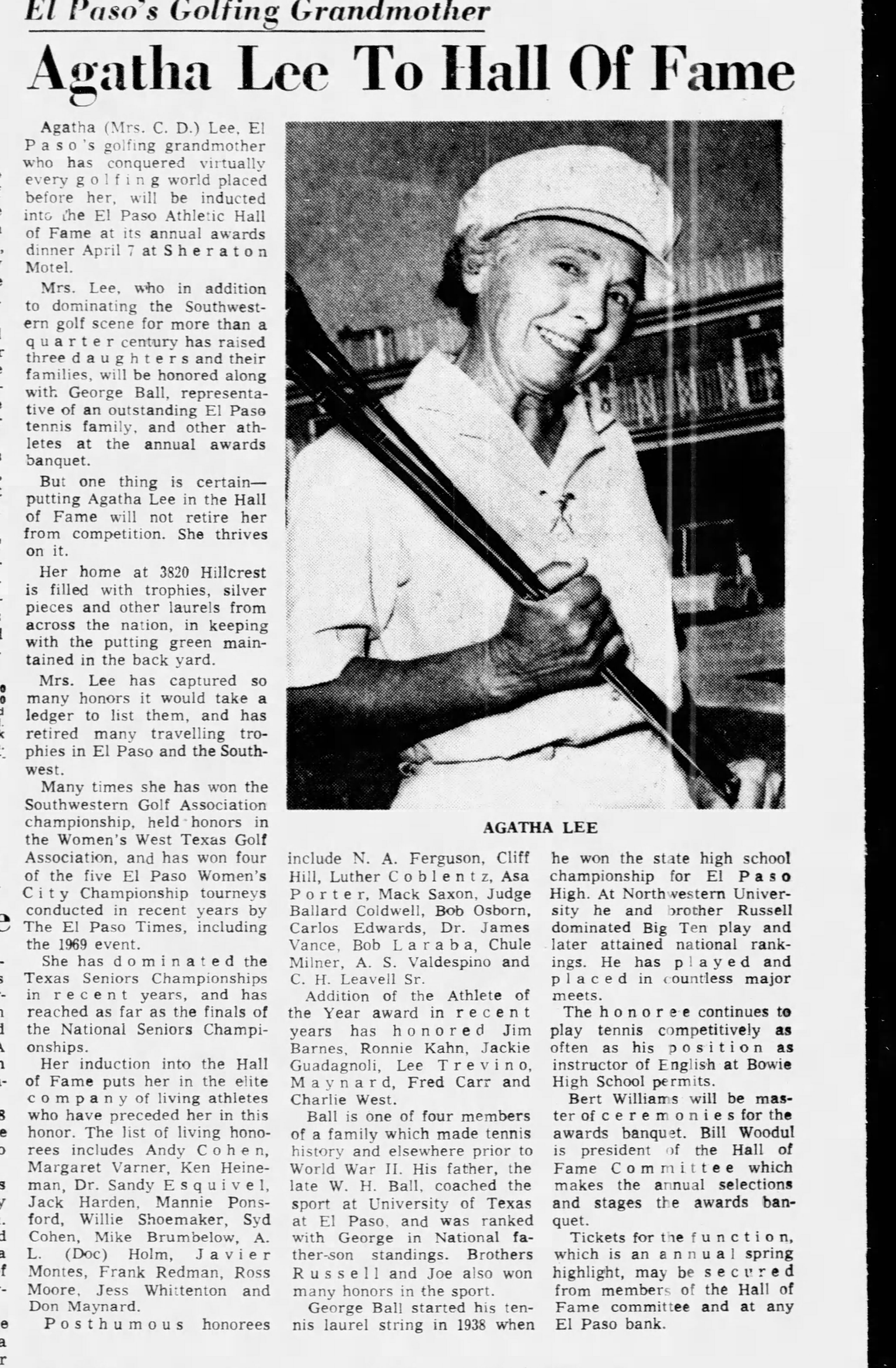 - 1970-Agatha Lee was El Paso Country Club Golf Champion 18 times.She was city champion seven times and the Ascarate Golf Course Club Champion twice. She won the Women’s Southwestern Golf Association and the Juarez Country Club Invitational championships twice each, among other accomplishments. Photo Credit; El Paso Historical Society.