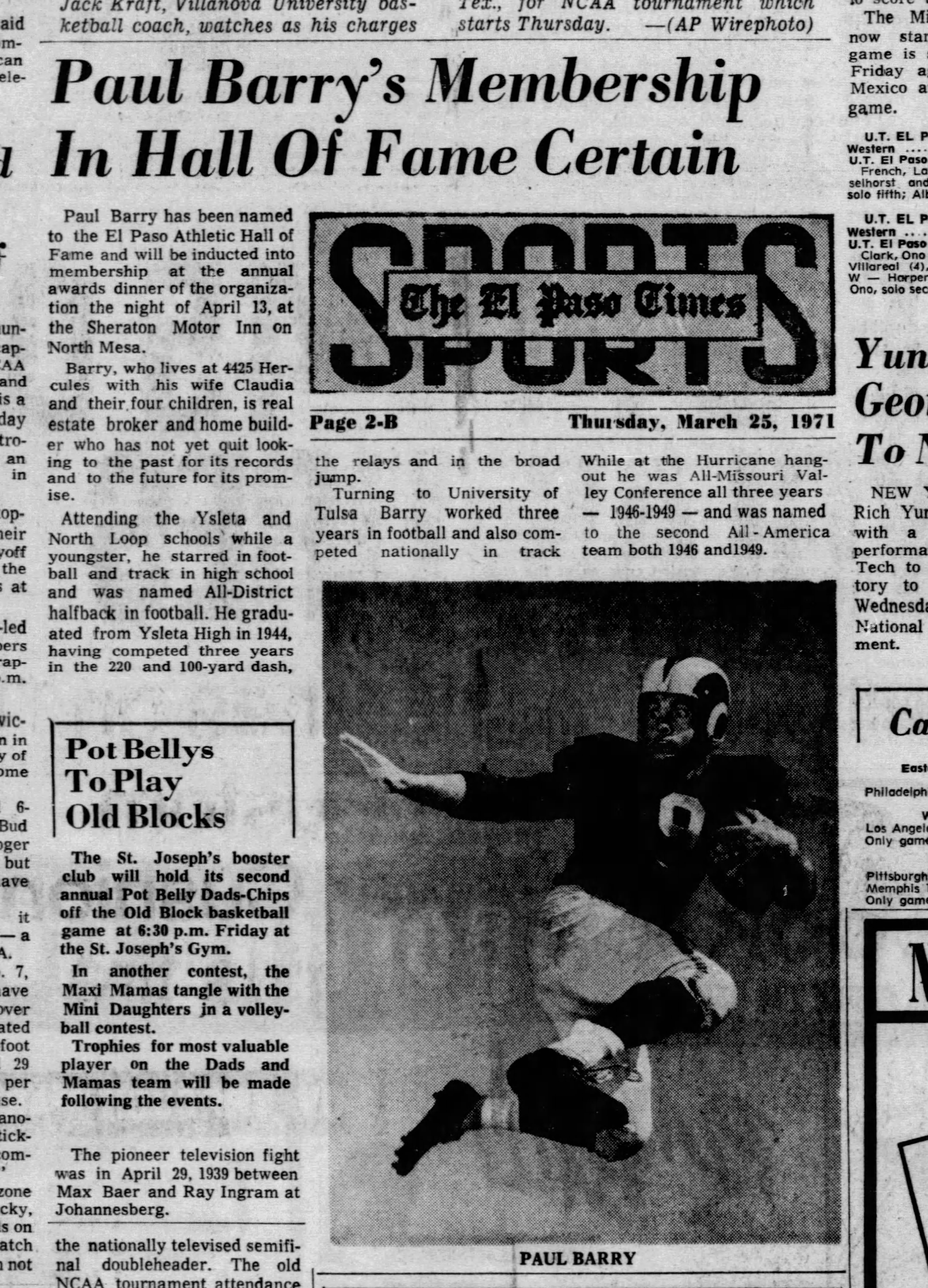 - 1971-Paul Barry was named All-District halfback in Football while on the Ysleta High School’s Football. He was also a star track runner .