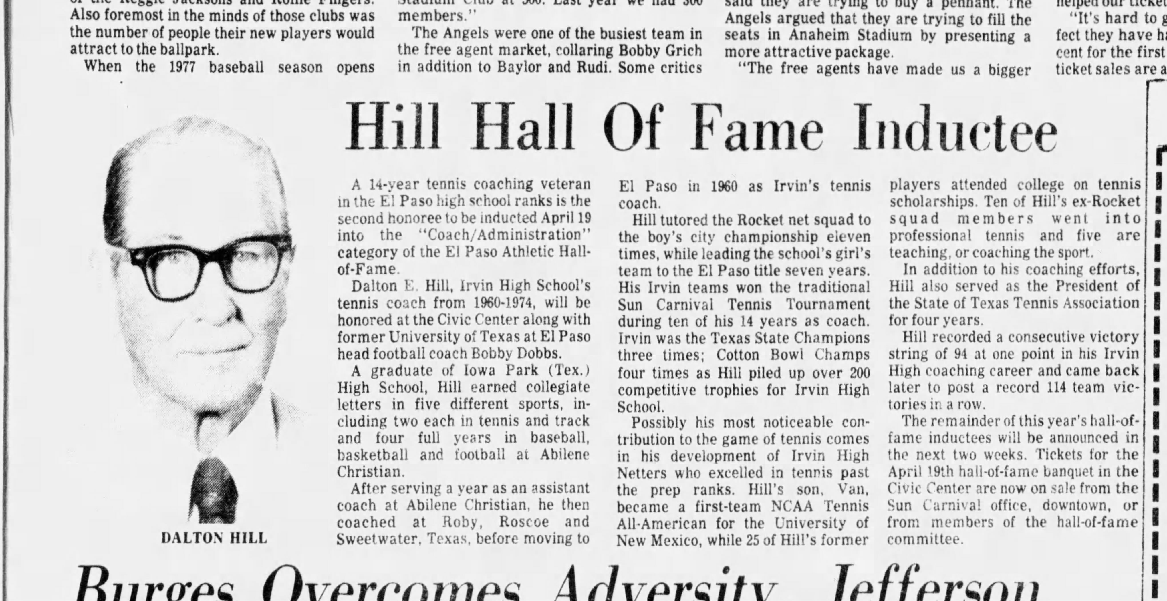 - 1977-Dalton Hill, Irvin High School Tennis Coach, 1960-1974.