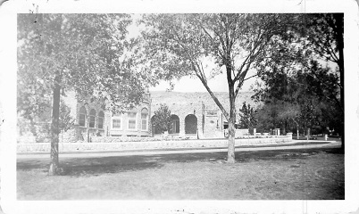 “The construction is of gray field stone, cunningly fitted together with mortar. The roof is flat, crowned with battlements. The center of the façade is rounded, with bay windows, and extending from either side is a wing. The front door is in the right wing as you approach the house, through an arcade. The house seems to face on Park Road, but the entrance is on Cincinnati Street.”