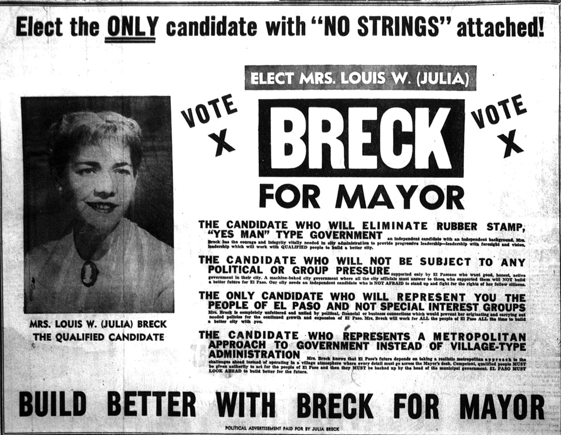 - Julia Breck, a local club women and outspoken community leader, ran for mayor of El Paso in 1961. She was the first women to run for that position and the first women to run for any city office in decades. She had little money and organization but Breck was no token candidate, she give the city male dominated establishment a scare almost doing the impossible, winning. Political observers called her a dark horse because she forced the assumed front runner, alderman Ralph Setisinger, into a runoff and campaigned vigorously and aggressively narrowly losing to Setisinger. Breck almost became the first woman mayor of El Paso and the first women mayor of a major Texas city.