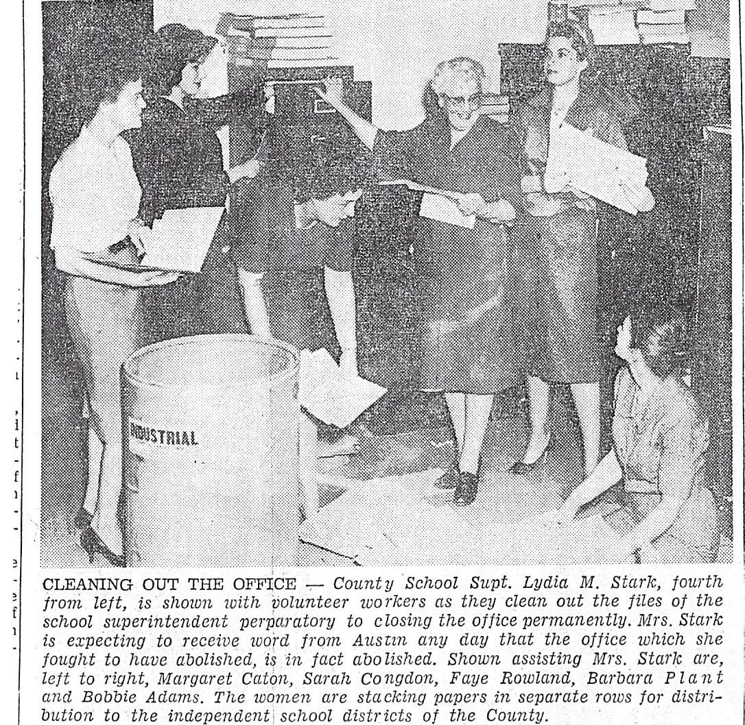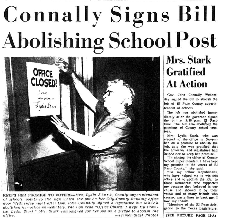 - Stark was able to get the needed 8,000 signatures to put the issue of abolishing the office of County School Superintendent on the ballot. This inspired the County Judge to talk to his friend, Texas Governor John Connally, and force through legislation, authored by Maud Issacks, that then went to the House floor for a vote. On February 13, 1963, the office was abolished. Stark put a sign on her office door stating, “Office closed, I have kept my promise.” Photo Credit: El Paso Times