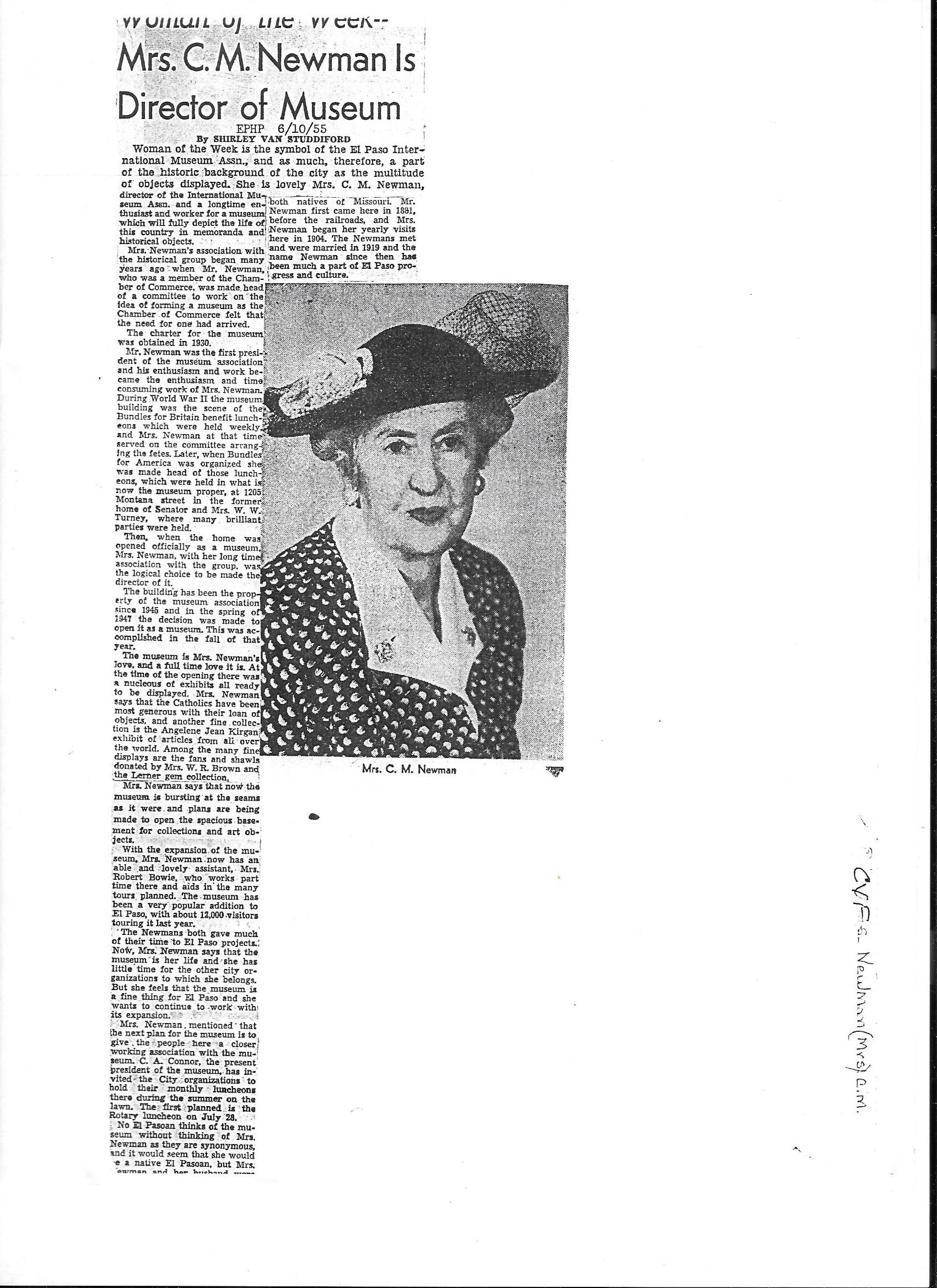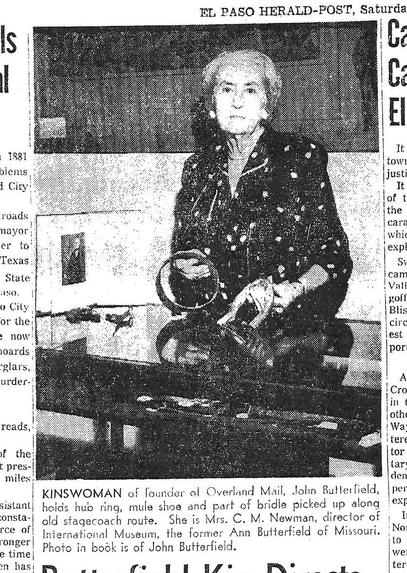 - Anna Butterfield Newman was born and rasied in Knob Knoster, Missouri in 1881 to Maurice and Luvina Butterfield. Newman first came to El Paso in 1902 and believed have met her husband,Charles Moorehead Newman on the Newman Family Ranch in Northeast El Paso. The Newman was a prominent farming family and land developers in El Paso. Charles developed a residential area across Newman Park . They lived on 2001 Altura in Central El Paso and they had one son,Charles M. Jr. The Newman’s married in 1919. Charles Sr. died in 1941. Anna help organized “Bundles for Britain” during WWII at the Turney Home at 1205 Montana,which in 1947 became the home of the El Paso International Art Museum. Charles Sr. was a organizer of the museum and served as the first president of the El Paso International Art Museum Association ,which was granted a charter by the state in 1930. The Turney Home came in possession of the association in 1945,but did not open until 1945. In 1947, Anna was appointed the first curator . As curator, she was credited for help to organize the museum,acquiring artifacts and planning exhibits,when the museum had no existing funds. Anna organized monthly programs at the museum and put on dinners and invited people interested in promoting and being involved in the museum. Newman helped build the museum to serve as a cultural center in El Paso. In 1957, Anna and a maid was tied up in the museum,when a young man broke in the museum and took several items of value. However Anna continued her work until her death in 1959. Mrs Robert R. Bowie was her assistant. Newman was a descendant of John Butterfield , the name stake for the Butterfield Wagon Trail route.