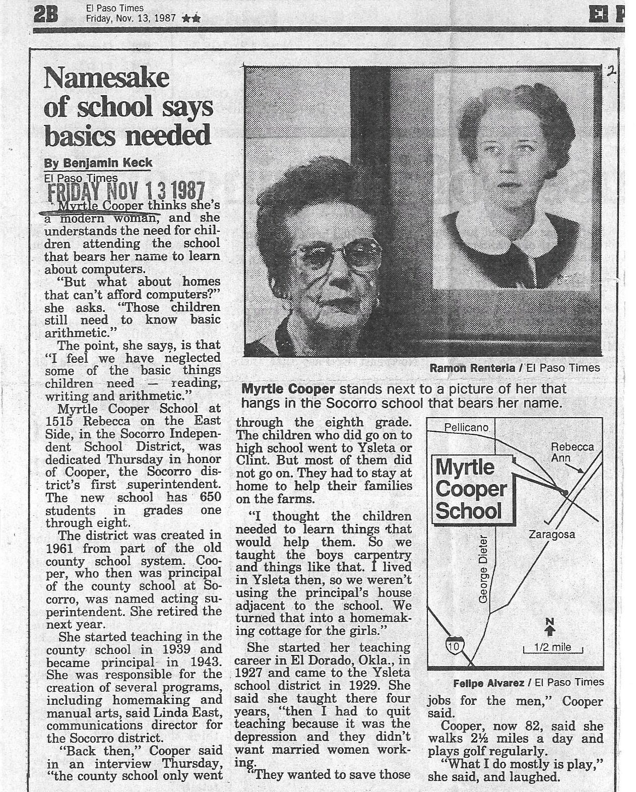 - Myrtle Render Cooper was the first woman superintendent of the Socorro school district in 1961 before she served as principal of the old Socorro grade school for 20 years. Cooper was born in Oklahoma, her father operated the old Ysleta Cotton Gin. Cooper came to El Paso in 1927, teaching at the Ysleta Grade School, there she met and married Forrest Cooper, who was also a teacher at the school. Cooper went on to serve as the associate superintendent of Ysleta Independent school district. The Coopers had two sons; Joe and Forrest Jr. Cooper returned to teaching in 1939, teaching at Socorro Grade school, now Silverio Escontrias Pre-K on Buford. Then in 1943 she became principal. Socorro was then a common school district under County Superintendent of Schools, John Bean. Cooper was the only woman principal in the Socorro common school district. Cooper developed a strong relationship with her staff, students,and their families. Cooper even helped some of her students find a job after graduation. At the time, Socorro schools started with kindergarten and ended at the eighth grade. Then students would attend Clint or Ysleta High Schools. Under Cooper, there was the construction of an auditorium,cafeteria, and additional classrooms, before the school had no cafeteria. The old principal’s cottage was converted into the homemaking cottage. In 1950, the longtime teacher, Dorothy Woodley was appointed the school first assistant principal. In 1959 the school published it first school annual. In 1961, when Socorro residents voted to become an independent school district, Cooper continued to act as principal but also served as superintendent of schools until 1962. She continued as the principal under the next superintendent, L.M Curlee until her retirement in 1962. Cooper was a accomplished golf and tennis player. In 1987 an elementary school in SISD was named in her honor. Cooper died in El Paso in 1991. El Paso Times