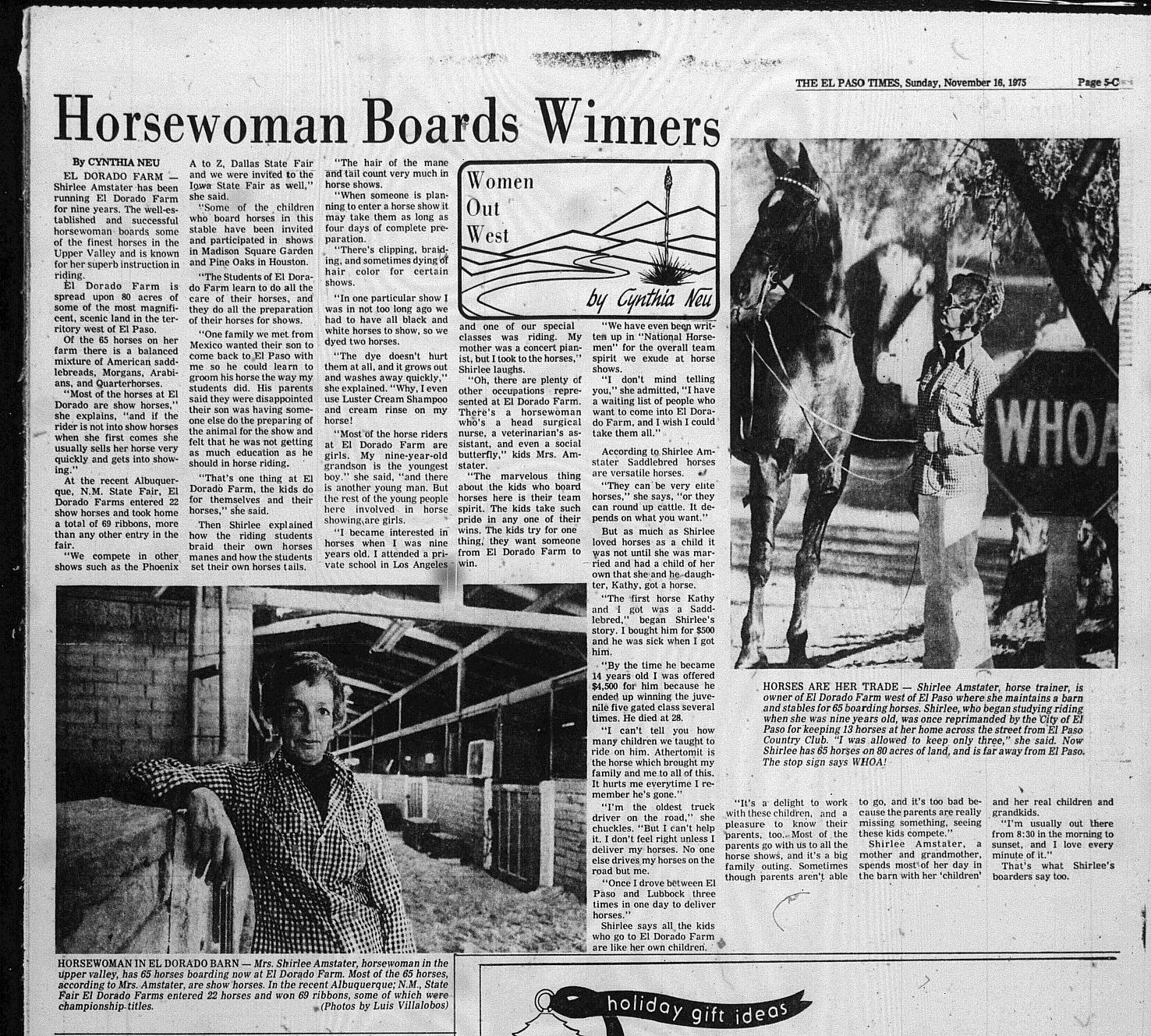 - Another prominent horse woman was Sheri Amstater. Amstater was a well-known horse instructor and ran stables and a horse riding school on her and her husband ranch called “El Dorado” in the Upper Valley. Amstater was publicity chair for the El Paso Horse and Driving club. Amstater was a native of California. She attended a private school in Los Angeles that offered horse riding . Armstater bought her first horse named “Kathie” a saddled bred for $500, she was able to get the horse at cheaper rate, because the horse was sick ,but was later offered $4,500 for the same horse ,because the horse won the state juvenile five gaited championships. Armstater studied art in Los Angeles. She was a member of the board of the El Paso Public Library and worked to get more art displayed from different artists. She also studied architecture. El Dorado was more then 80 acres with 35 horses, with different breeds that included America Saddle breds, Morgans, Arabians, and Quarter horses. In 1975 El Dorado entered 22 show horses in the New Mexico State fair held inAlbuquerque and took home 69 ribbons. El Dorado also completed at the Phoenix A to Z, Dallas State Fair and was invited to the Iowa State fair. Armstater was once reprimanded for keeping 13 horses at her home across from the El Paso County Club. She later moved out of the city limits to the Upper Valley where she and her husband Joe started “ El Dorado” Amstater was a member of the Shandor Equestrian Team of El Paso, founded by Juan Munoz and his wife, Dorothy. They created the organization with 12 men and women to perform “Quadrille” and they would frequently perform at the Sunland Park Race Track.