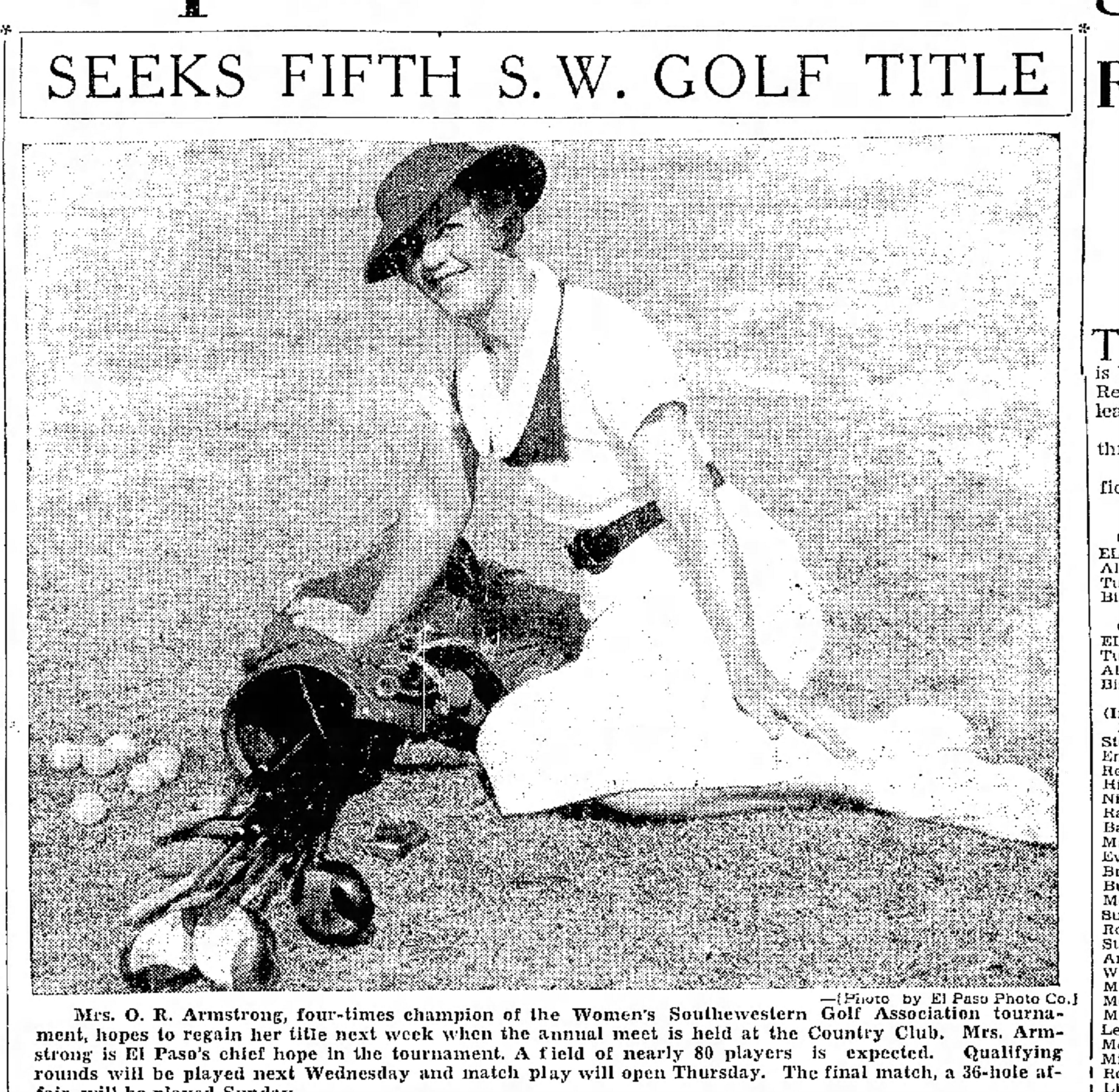 - Reba Armstrong was the first El Paso woman to win the Women’s Southwestern Golf Association’s tournament championship title in 1930. Armstrong won the Cloudcoft Tournament in 1931. Armstrong was one of the first members of the El Paso’s Golf Hall of Fame. She broke records at El Paso Country Club, scoring in the high 70s. Armstrong won nine golf championships from 1928 to 1930. She set course records in 1930, 1933, 1935 and 1936. Armstrong finished second in a state championship tournament in New Mexico. Armstrong was the first woman to play in an El Paso male tournament