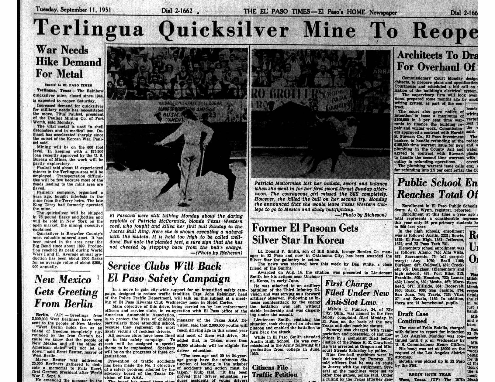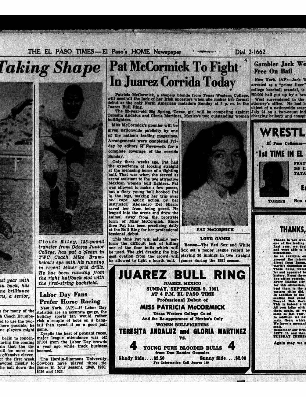 - Patricia debuted in the Juarez bullring on Sep 9,1951. Patricia joined the Mexico matador union and in 1952, the first american women to do so She .was one of the first women in Mexico to be allowed to perform in the same manner as men. She was gored by bulls six times,but survived pitted one time,she was expected to die. Sep 11,1951 Photo Credit: El Paso Times