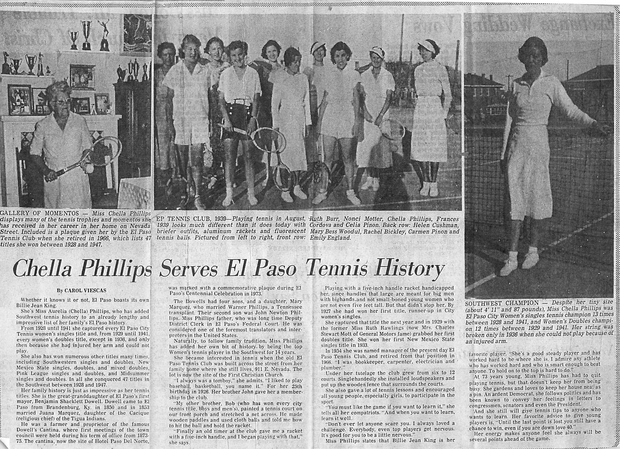 - Aurelia Phillips competed and won championships not just in El Paso, but all around the Southwest. Phillips was an El Paso City Tennis Singles Title Champion from 1928 to 1941. She won the Doubles titles 12 times and with George Cound and Russell Ball, she won mixed doubles twice. She also competed in the Southwestern and New Mexico State event and earned over 50 titles in nineteen years. Phillips retired from tennis after a knee injury in 1947. In 1955, she wasappointed manager at the El Paso Tennis Club, serving until her retirement in 1966. Credit: El Paso Times