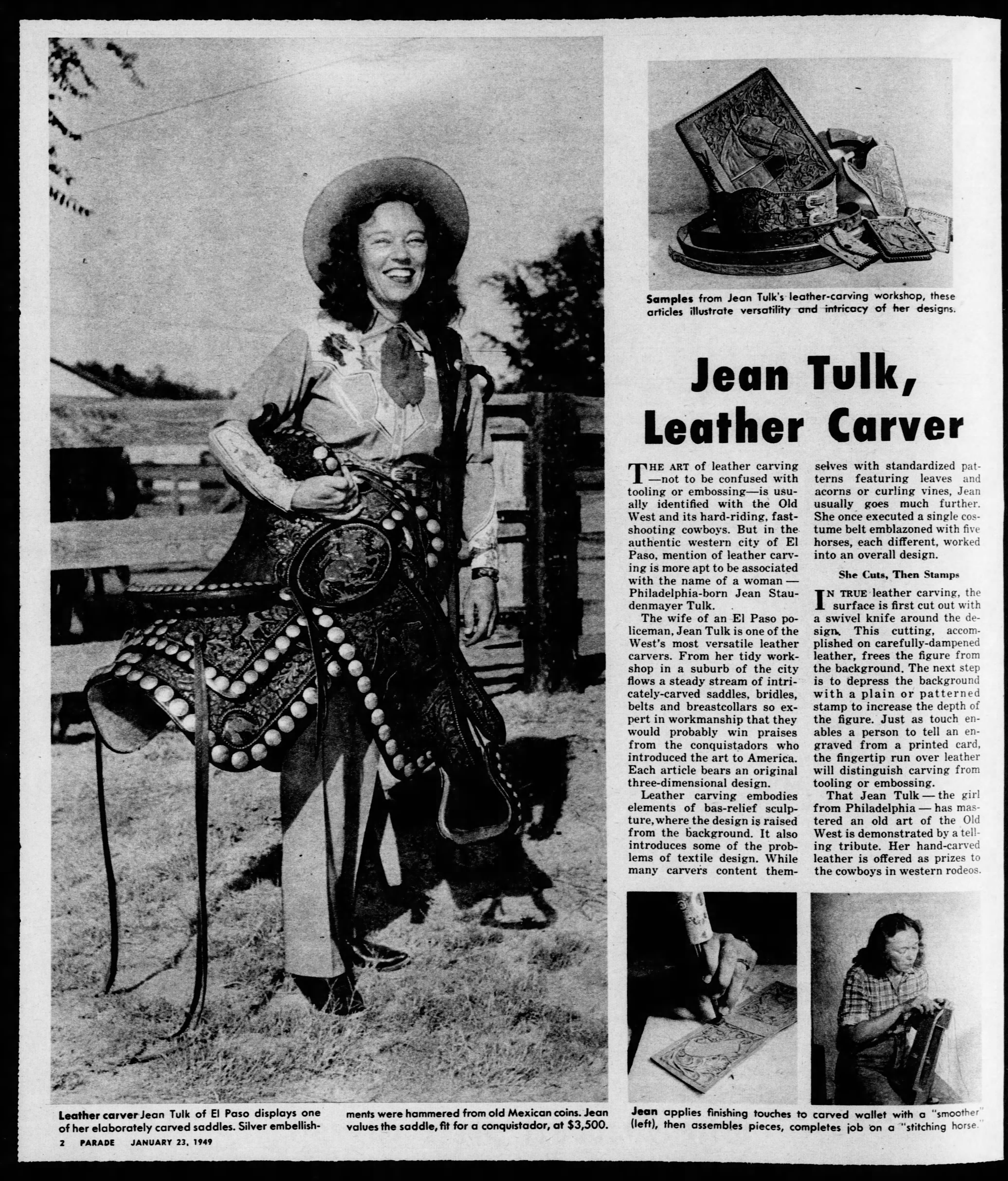 - Elise Jean Staudenmayer became a trick rider, winning many competitions with her prize horse named Eagle. It was while in Brownsville, while showing Eagle off at a fair, that Walter Adams asked her to come to El Paso to train horses at the famous Cowboy Rodeo Park on Polo Road in Ysleta.A group called the Rough Riders was also found there. She stayed in El Paso, and in 1939 she worked as assign marker and clerk for Kress Department Store. In 1940 she was hired to work for S.D. Myres, a famous saddle maker. Initially, she was a saleswoman but eventually trained under Myers, becoming a well-accomplished leather carver and saddle maker. Many of the saddles, boots,and other creations she madewere used as awards in rodeos and other competitions. Jean also designed a medal for El Mada Shrine. She lived in North Loop Gardens and had her own workshop. She also ran a phonograph record shop near her ranch