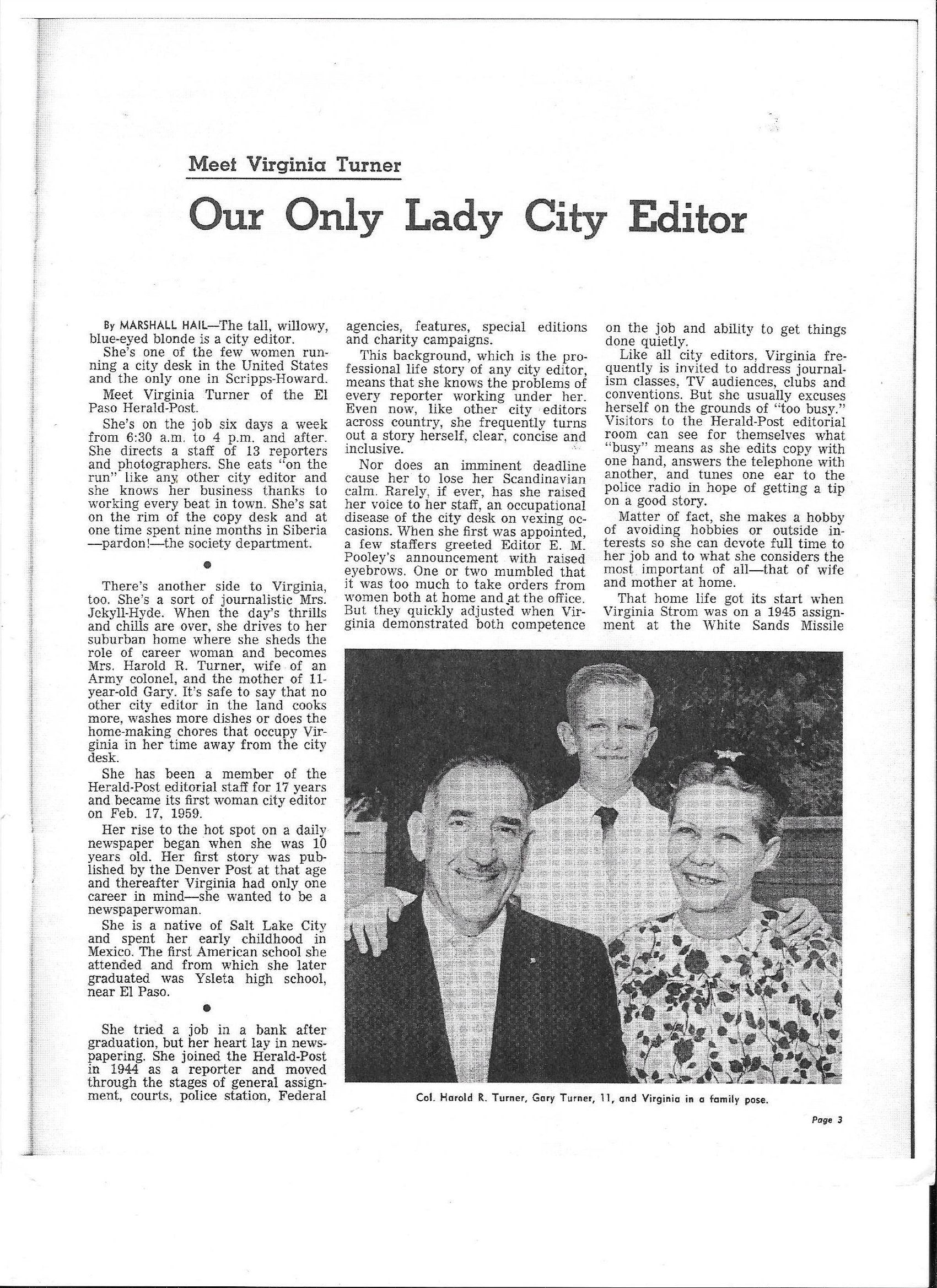 - Virginia Storm Turner started working as a cub reporter for the El Paso Herald-Post in 1944 and in 1959 was promoted to city managing editor, becoming the first woman city editor in the Scripps-Howard newspaper chain. She retired in 1976 but continued to write columns on the city’s history and personalities. Photo Credit: UTEP Library Special Collections , Virginia Turner Papers Ms 484