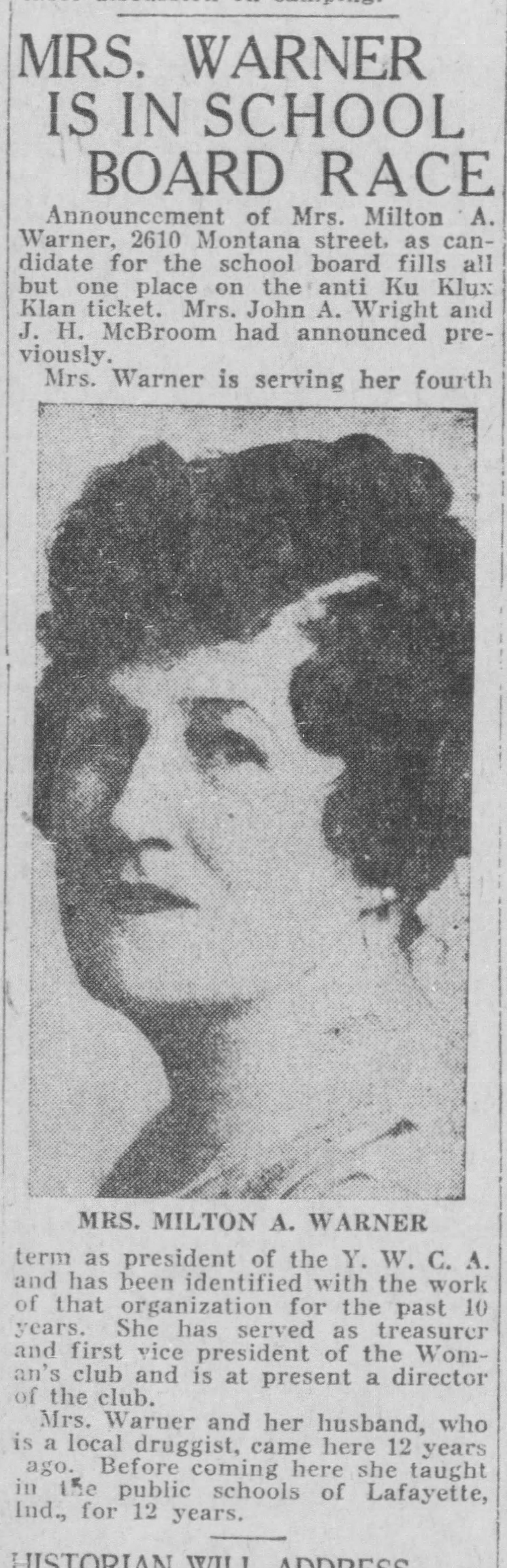 - Jennie Westfall Warner was born in Shelby County, Indiana. She was a teacher for 12 years. Warner served as president of the El Paso Women’s Club, and served on the board of the El Paso YWCA. Warner was elected to the El Paso School board in 1923, serving as board secretary and chaired the district’s Finance Board until her retirement in 1933. Warner was elected to the El Paso School Board on an anti-Ku Klux Klan ticket in 1923 and was vocal about her opposition to the Klan. Warner also headed the Women’s Auxiliary at the first Presbyterian Church. Warner also headed a charity drive for the community chest.