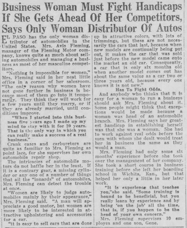 - In 1923, Avis Fleming was reported to be the only first woman car distributor in the U.S.