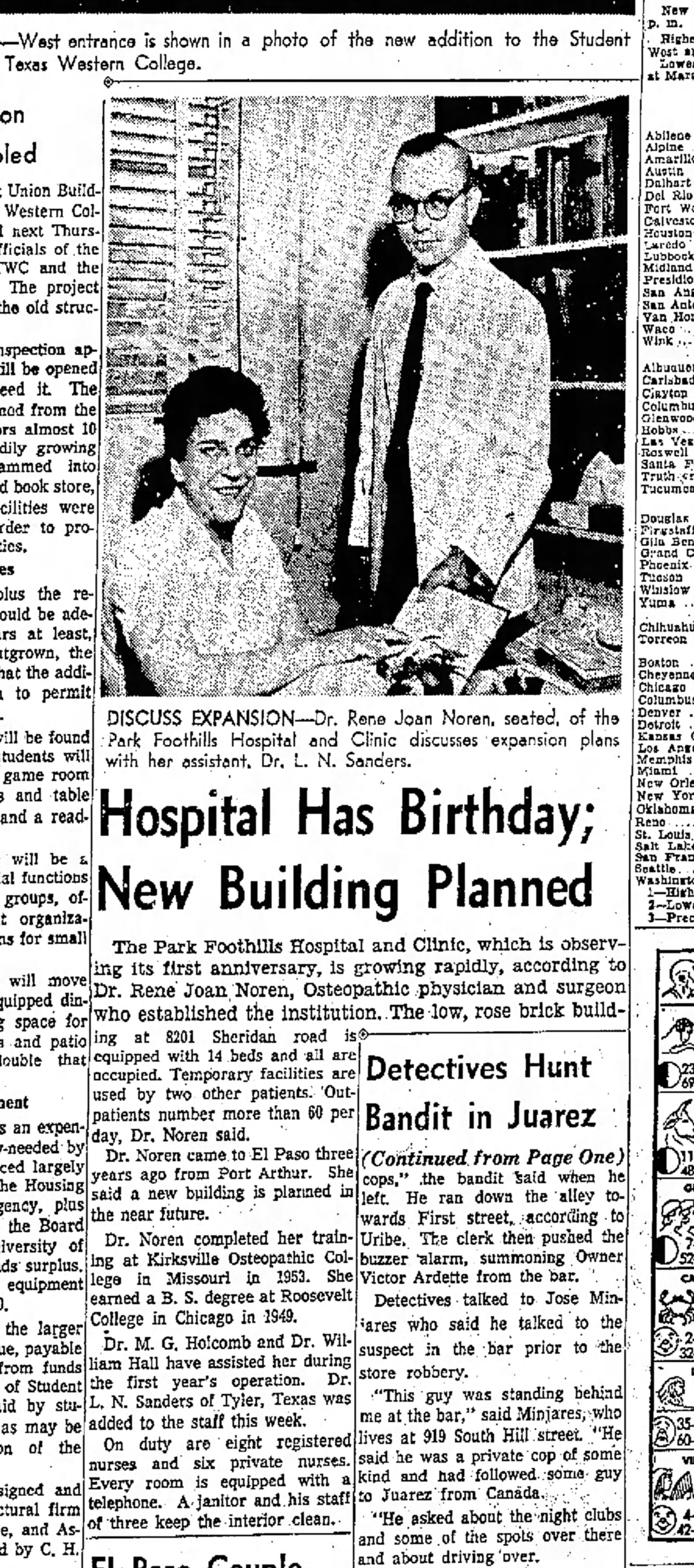 - Dr. Rene Noren was born in 1926 in Chicago. She earned a B.S. from Roosevelt University and earned a degree from Kirkville College of Osteopathy. She opened up her own clinic in El Paso in 1955 called, Park Foothills Hospital Clinic. Dr. Noren served as an examiner for the Federal Aviation Agency and for the Association of Aerospace Medicine. She was named in “Who’s Who of American Women” and wrote an article on a type of congestive failure in an osteopathic magazine. Noren was an examiner for Pan American Insurance, the first El Paso osteopathic doctor and surgeon to be chosen. Prior to her arrival to El Paso, she was practicing in Port Arthur. Dr. Noren was chosen to be the Sunrise Shopping Center Woman of the Year. She served in the U.S. Women Army Corp. Noren’s Hospital was on 8201 Sheridan road. Dec 5,1959, El Paso Herald Post.