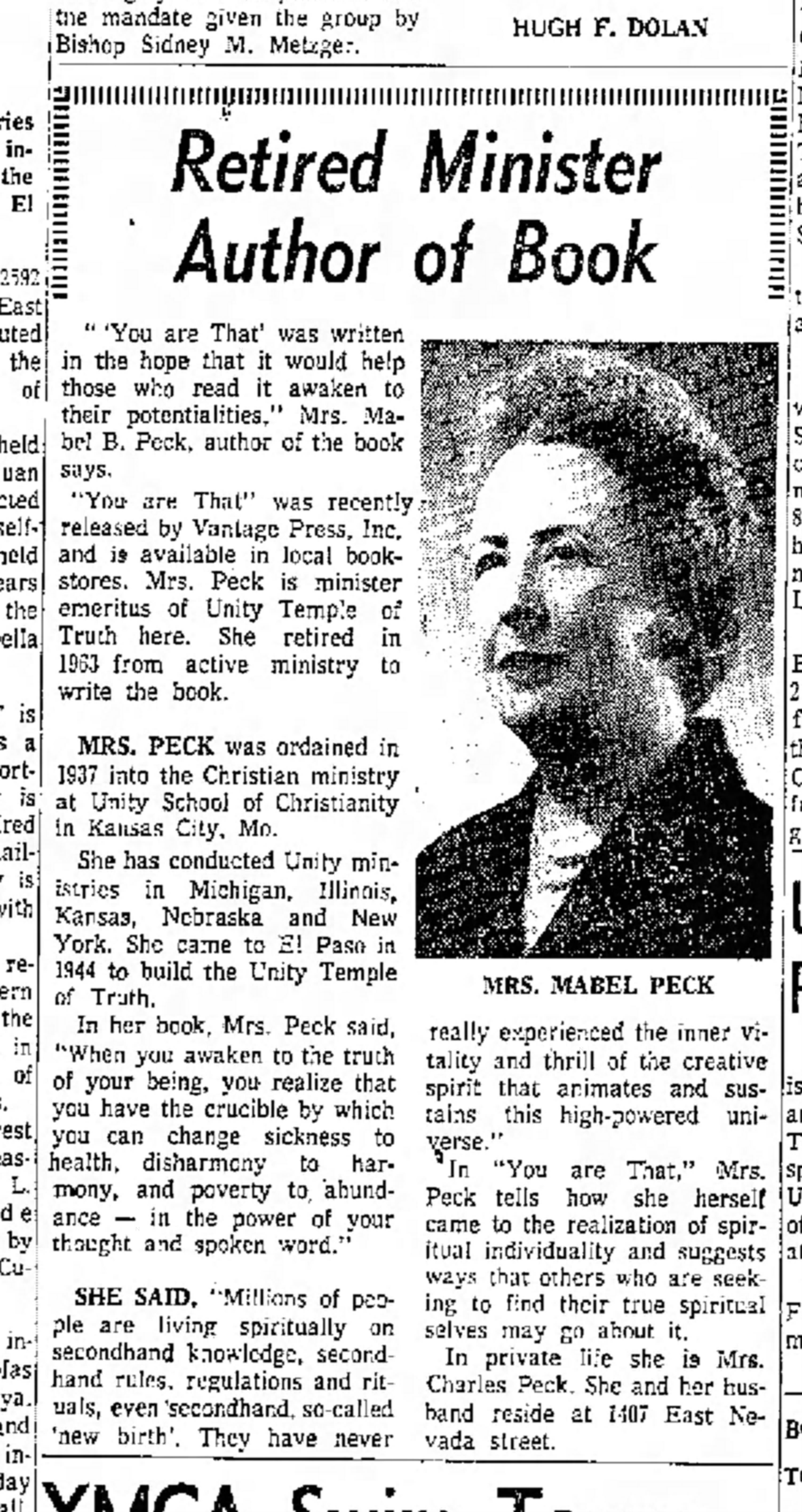 - Mabel Peck was a minster and led the Christian Unity starting from the 1940s to the 1960s. Peck also was a published author. El Paso Herald Post June 19,1965