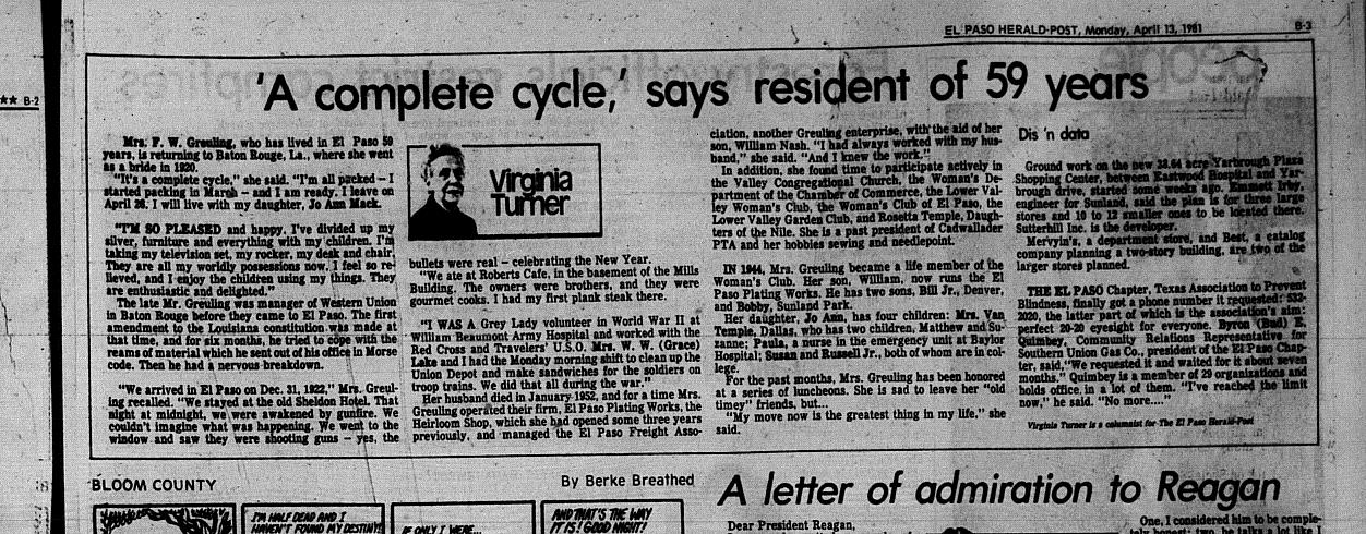 - She was president of the Lower Valley Women’s Club, a member of the El Paso Women’s Club, president of the New Mexico-El Paso Congregational Women Fellowship, she was also active in the Lower Valley Congregational Church and the Lower Valley Garden Club and the El Paso Women’s Department of the Chamber of Commerce. Greuling also went into real estate and was purchasing agent for a supply company. Grueling was active in the Ysleta School PTA and unsuccessfully ran for the Ysleta School Board against the incumbent, Jerry Stevens in 1942. Grueling died in 1988.