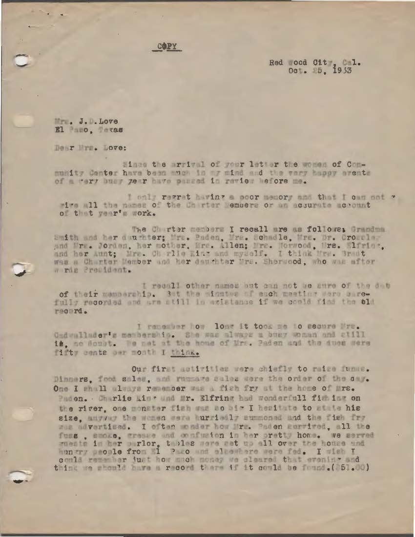 - Letters to Mrs. J.D. Love from the first president, Jennie Downs discussing the founding of the club.
