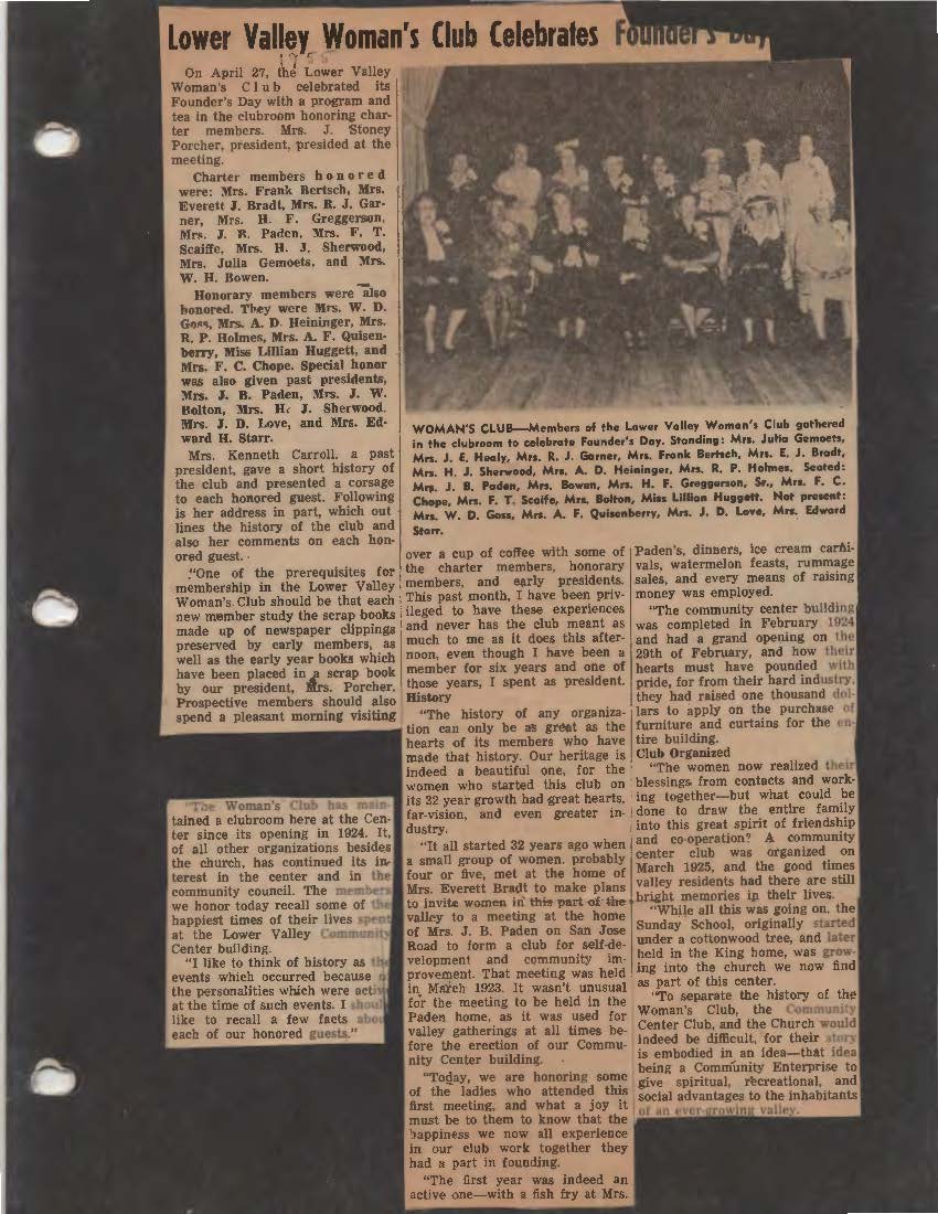 - The Ysleta Woman’s Club was organized in March 1921 at “Sunnyfields” on Alameda, the home of Mrs. J. Stoney Porcher, which later became Cesar Chavez Academy. The club’s first president was Mrs. W.B. Abadie. Other officers included Anne Whitney, vice president Elinor Porcher, treasurer Gertrude Cadwallader, secretary Mrs. Owen White and Mrs. N.N. Bourland. Other founding members were Pearl Crossley, Mrs. J.L. Reid, Mattie Graves, Essie Paden, Mrs. T.N. Williams, Lucy Brooks, Helen Lang, Christine Bower, Mrs. George Spencer, Emilia Foix and Jennie Downs.