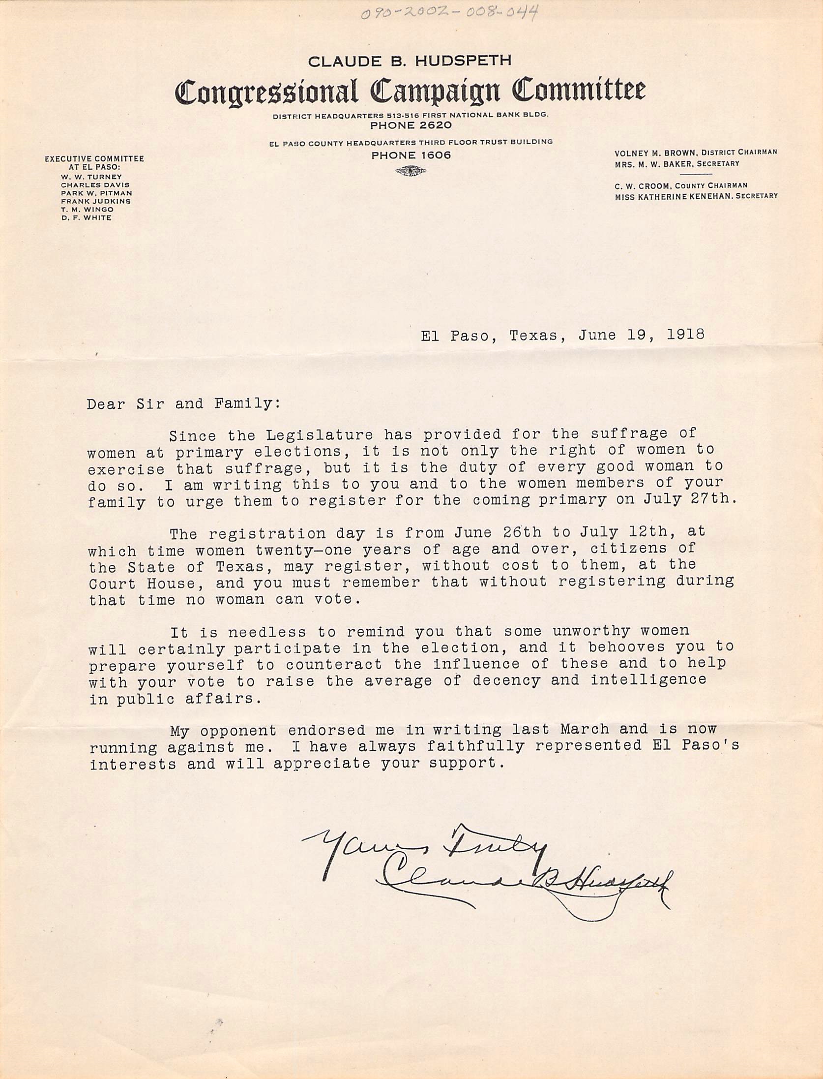 - A letter written by El Paso Congressman Claude Hudspeth in support of suffrage. EPCHS Archives.