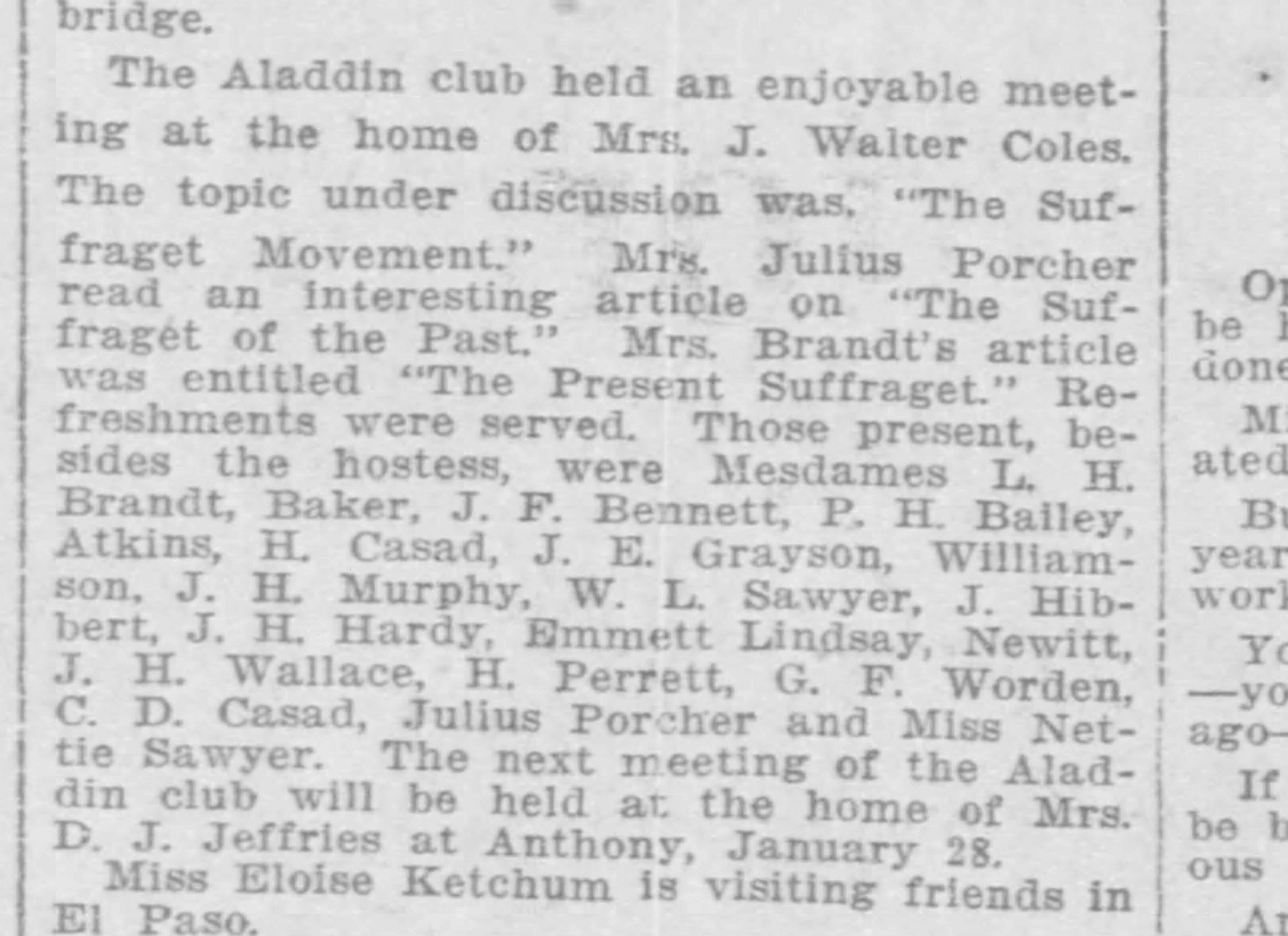 - In 1913, the Aladdin Club, a women’s club was founded in Canutillo. The first president was Mrs. Julius Porcher. The club worked to improve the quality of life in Upper Valley El Paso and to foster a sense of community.