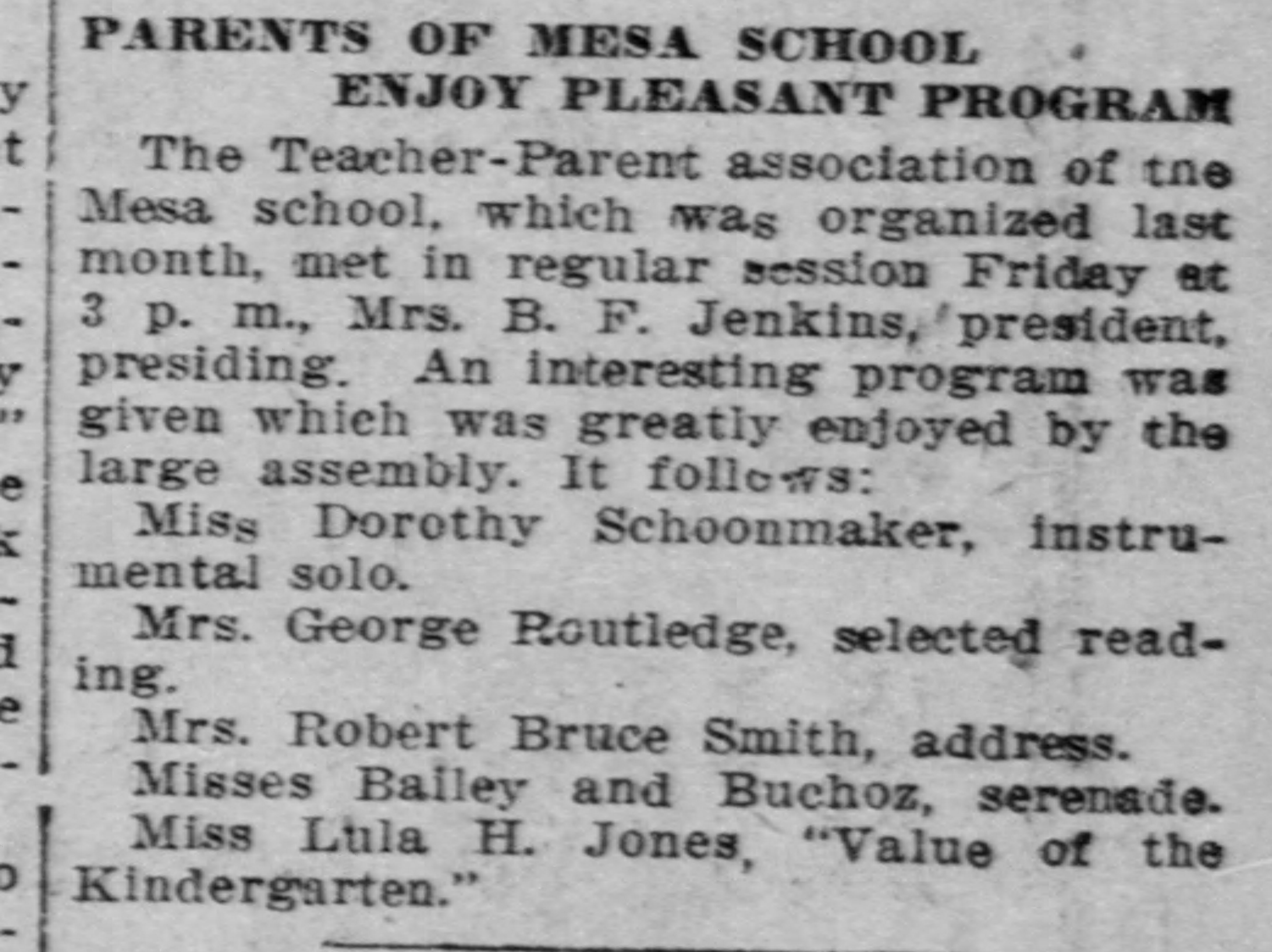 - One of the earliest Parent Teachers Associations was founded at Mesa School in 1910.