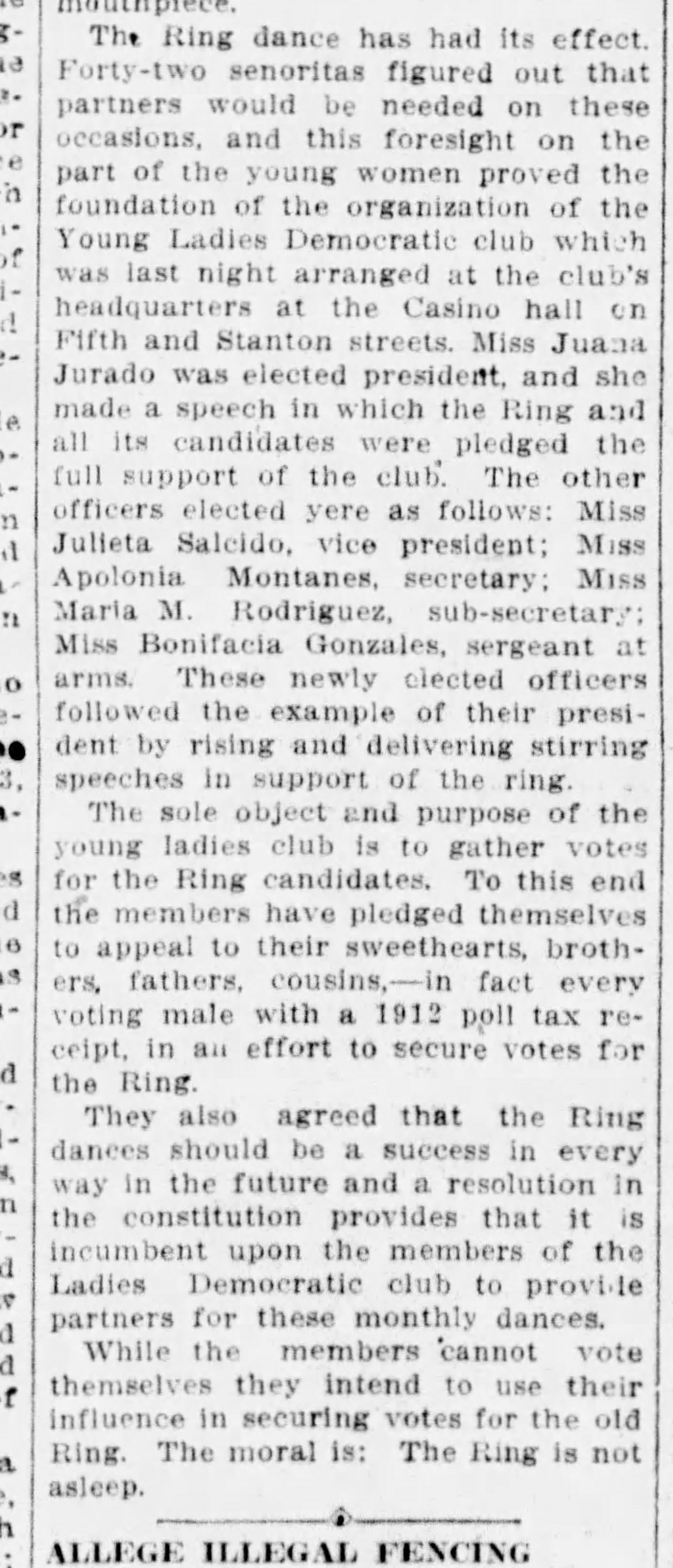- In 1912, A Young Ladies Democratic Club was organized led by Juana Jurado. They campaigned for the political establishment and backed the county ticket in the 1912 Democratic Primary.