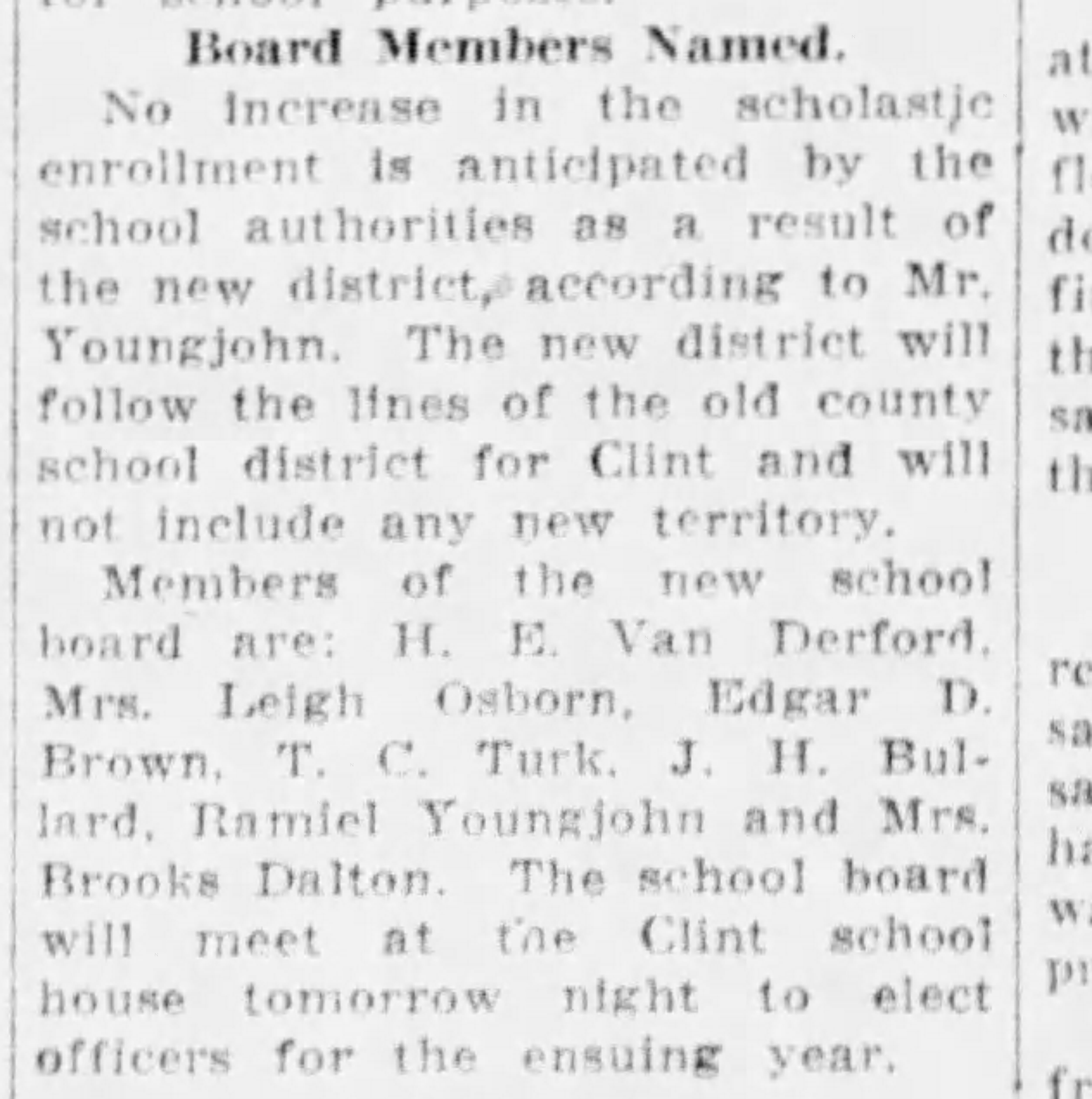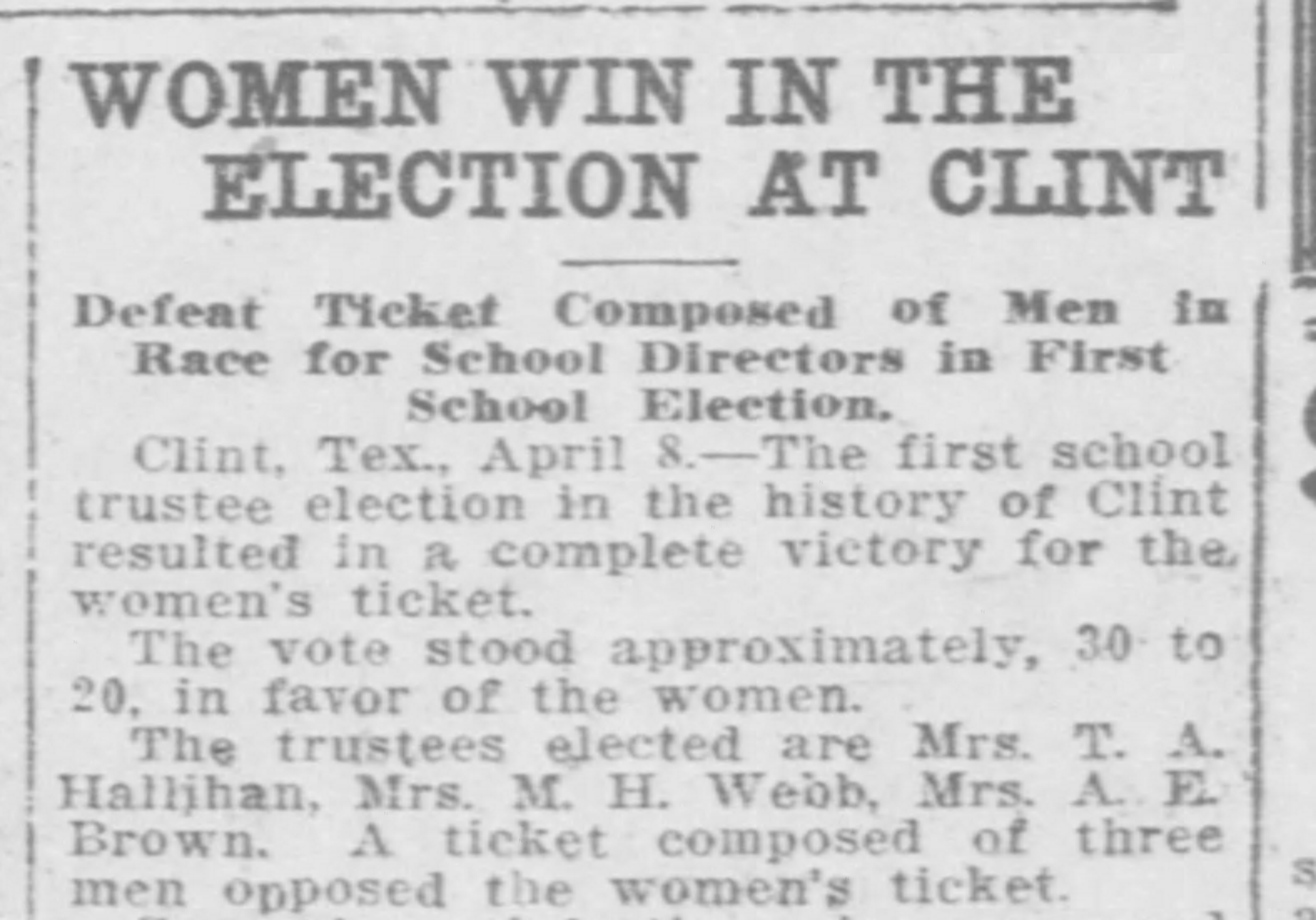 - In 1913, an All-Woman school board was elected in Clint, composing of Mrs. T.A. Halihan, Mrs. A.E. Brown, and Mrs. M.H. Webb. In 1929, when Clint became an independent school district, Josephine Silvas Dalton was one member of the first board of trustees and might have been one of the earliest Hispanic women to hold elected office in El Paso.