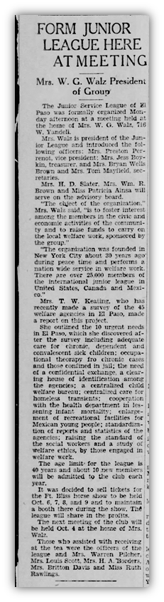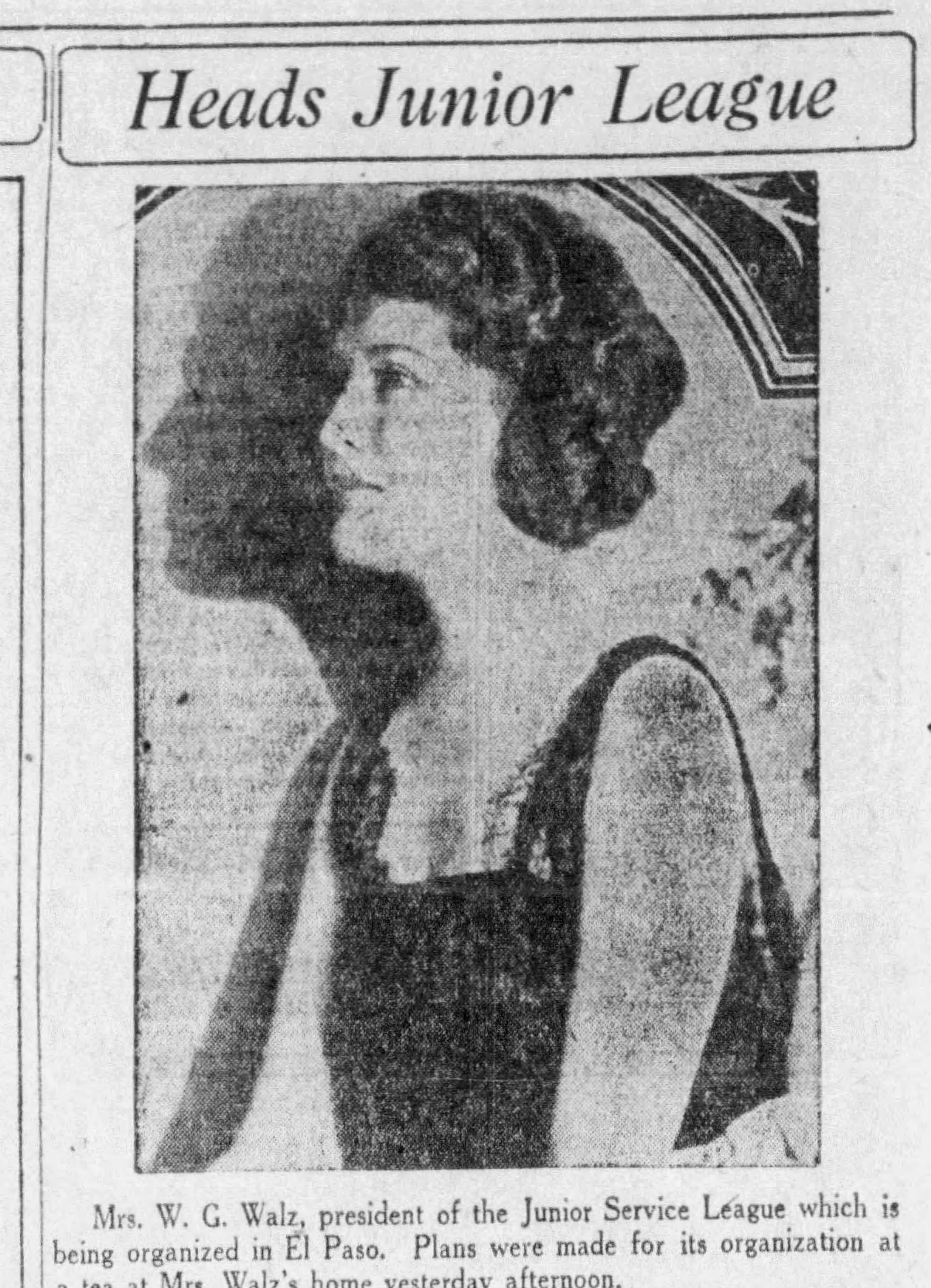- The Junior Service League was organized in 1930 with Rosalie Behr Walz Walters as president. It was a group of young women who devoted themselves to volunteer work. They raised money for various charities and health clinics. They reorganized into the Junior League in 1933. They also founded the Social Service Exchange, the first charity clearinghouse in El Paso.