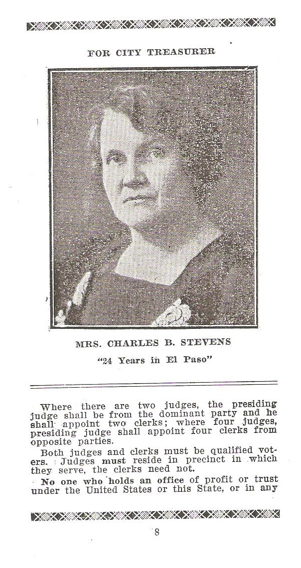 - Emma Stevens, who served as President of the El Paso Woman’s Club was the first woman to run for a city office, when she was nominated for city treasurer by the local republican party. In 1921 she was defeated by a Democrat, Dan Sullivan. Courtesy of the Border Heritage Center, El Paso Public Library