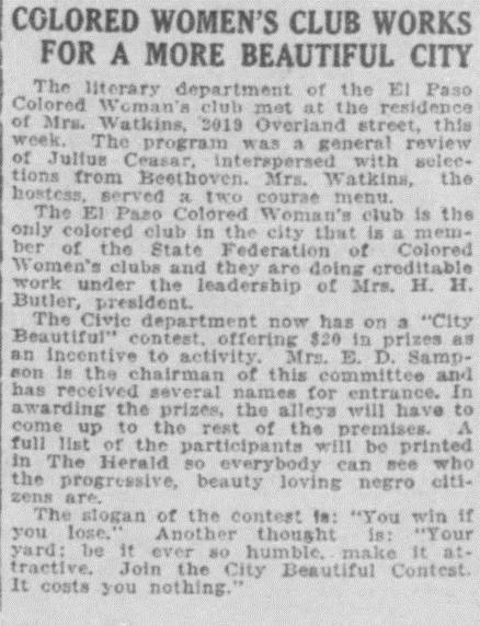 - A community service group for African American women who studied local issues and was also a community service organization. It was a member of the State Federation of Colored Women’s Club. April 4, 1916, El Paso Herald