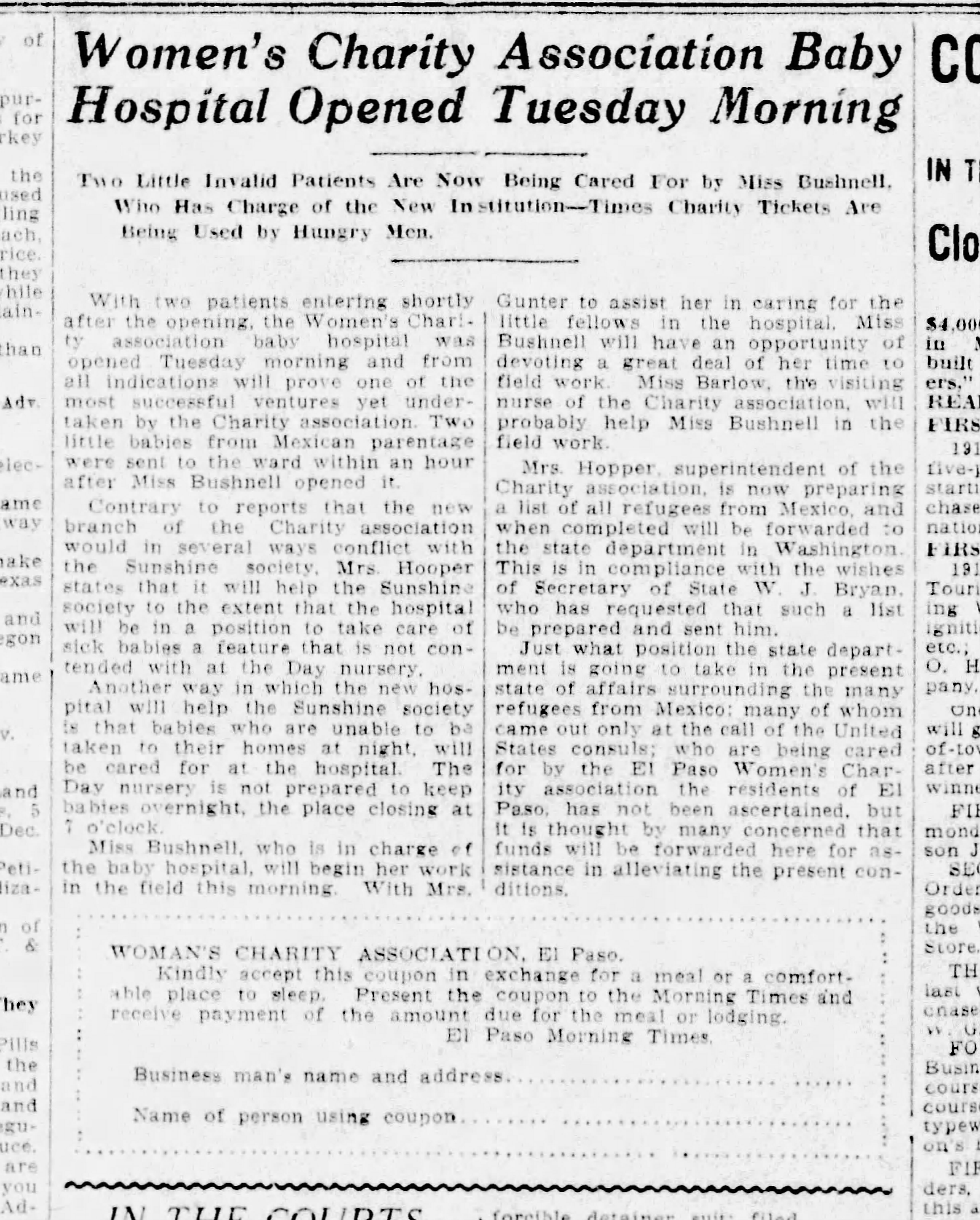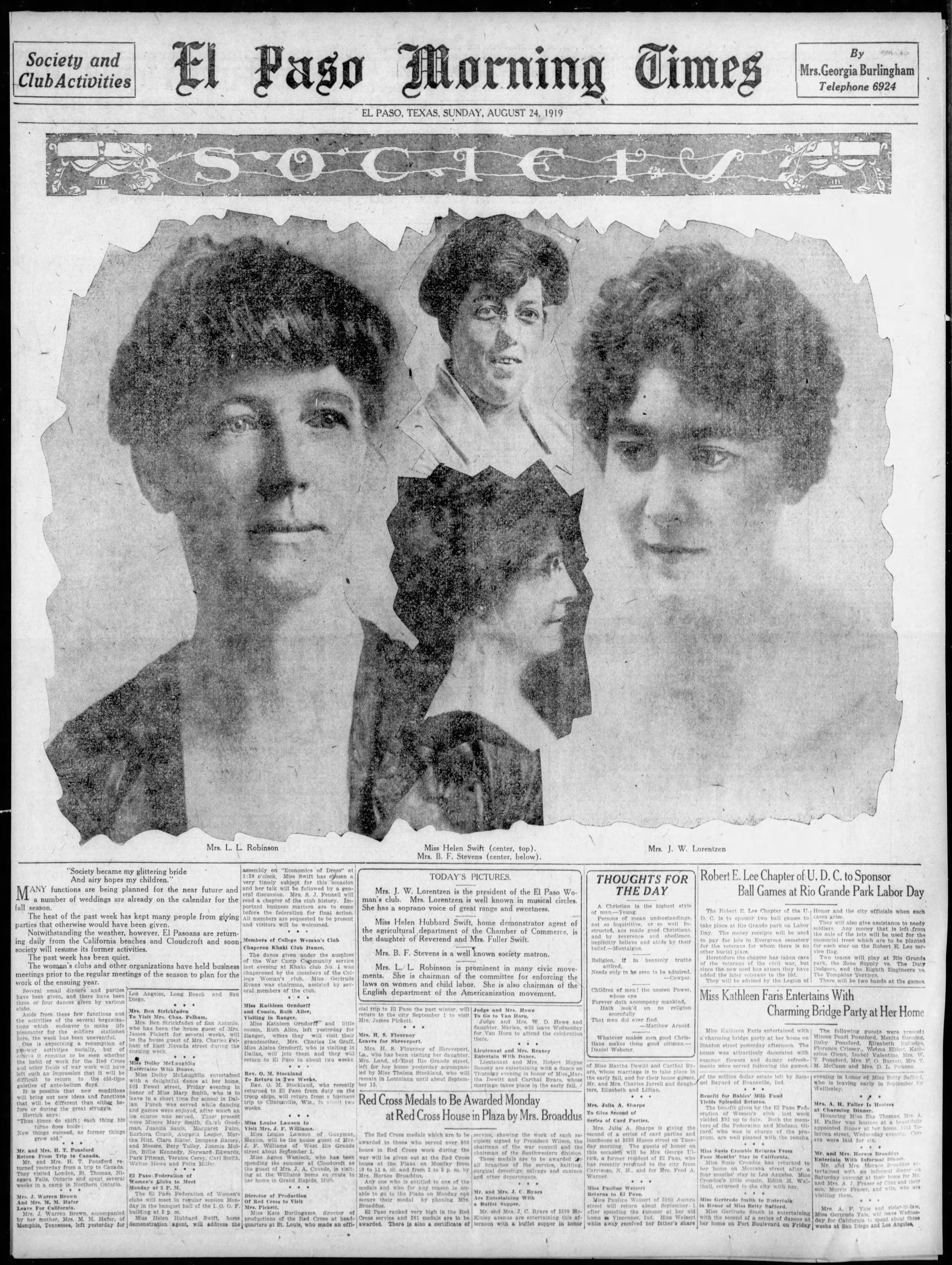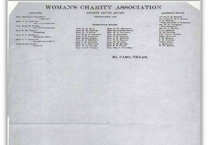 - The Ladies Benevolent Society was reorganized into the Women’s Charity Association in 1902 by Mrs. J.A. Eddy, Mrs. Jacobo Blanco, and Eugenia Shuster to expand the charity works outside of churches. Other women noted for their outstanding activism were Anna Burges, Carrie Sutherland, Octavia Magoffin, Carrie Race, Nellie Coles, Mrs. U.S. Stewart, Mrs. Zach White, Mrs. H.M. Broaddus, and Mrs. A.M Loomis. Border Heritage Center, El Paso Public Library
