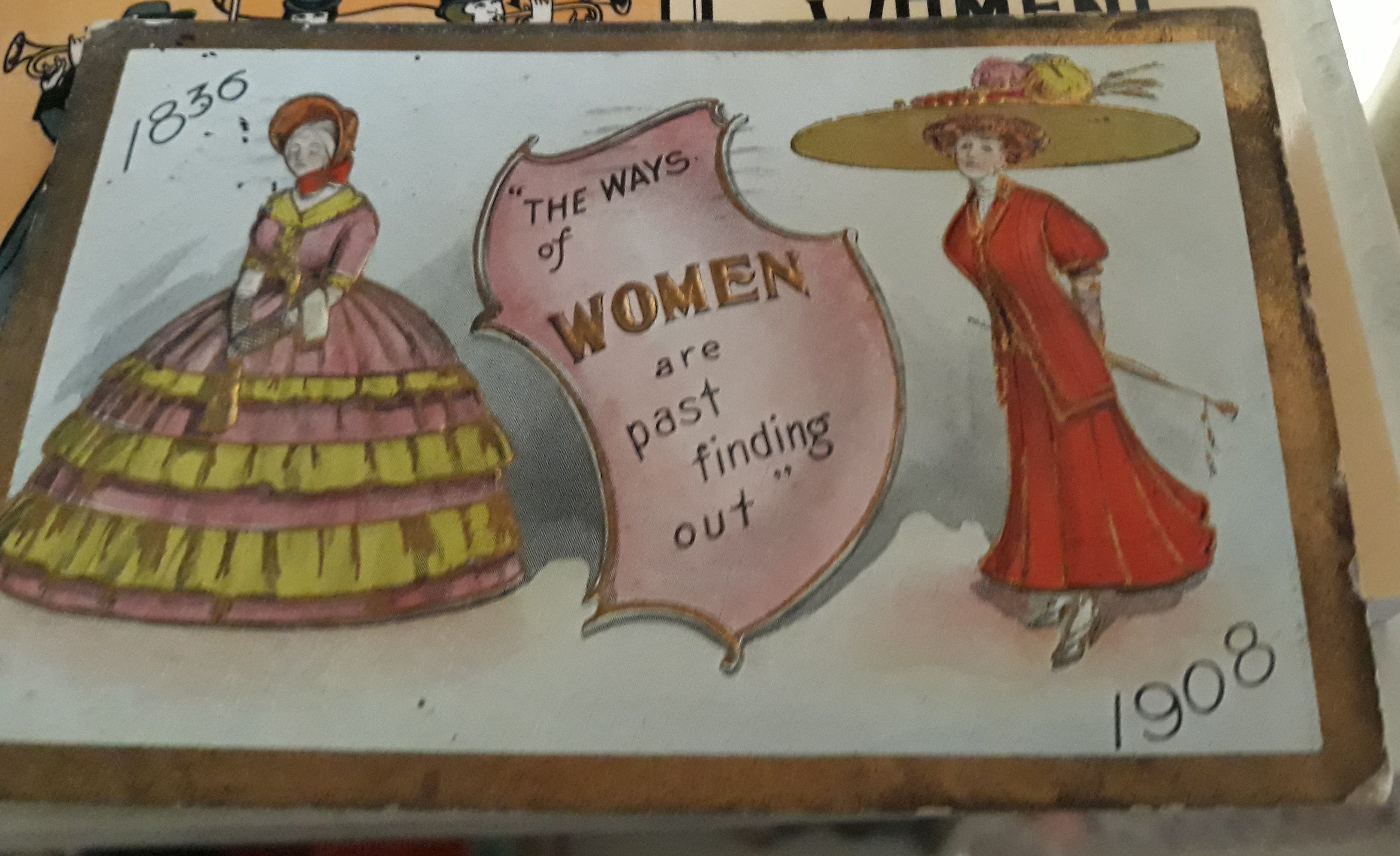 - Pro-suffrage postcard addressing the changes in women’s fashion and its connection to their awareness of suffrage.
