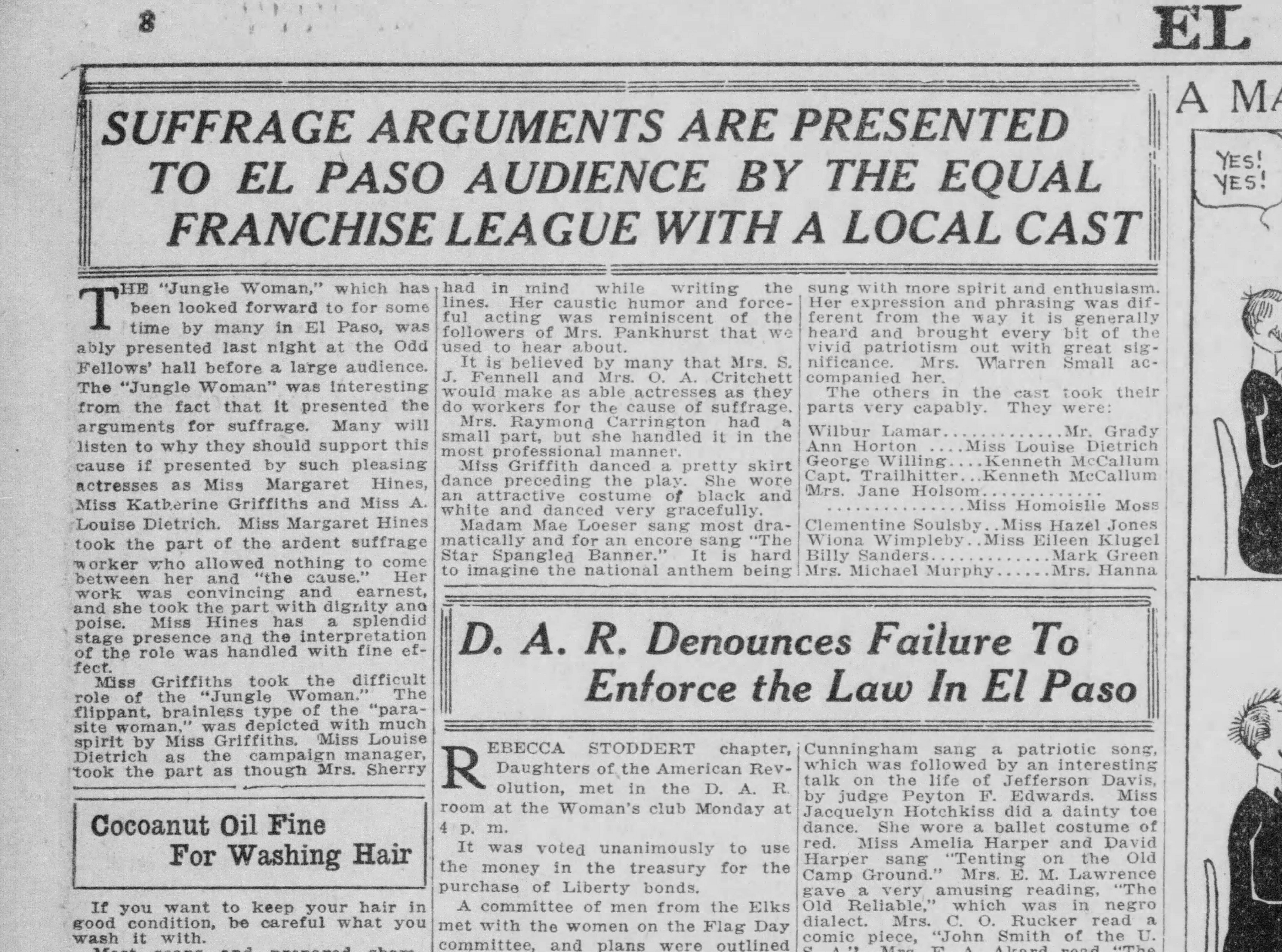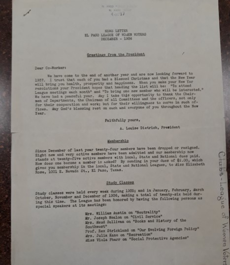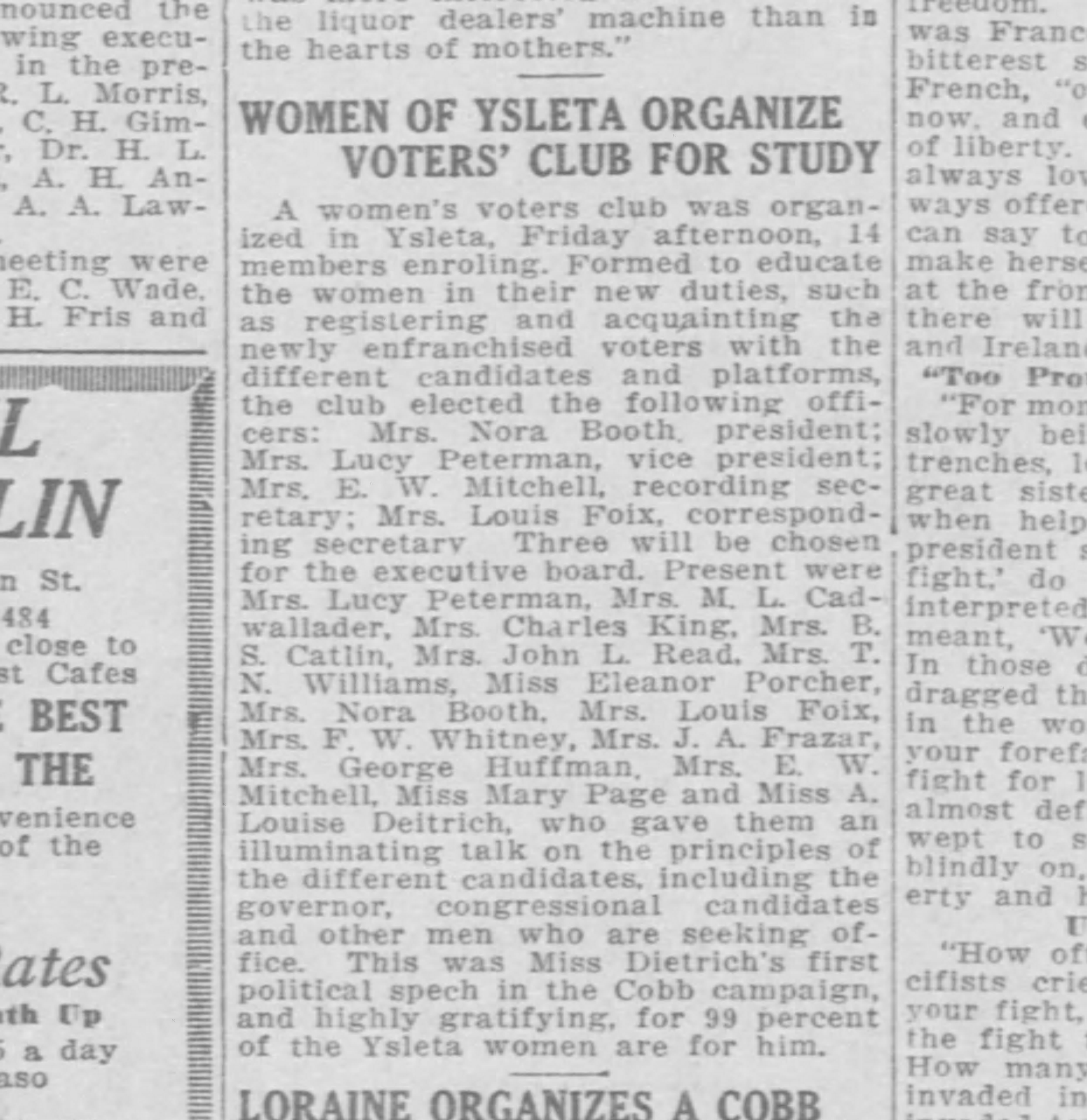 - A. Louise Dietrich, a registered nurse, was appointed by the Texas State Equal Franchise Association as county chairwoman in charge of canvassing women voters. Dietrich went on to serve as president of the El Paso and the Texas League of Women Voters. El Paso Times Dec 14,1941