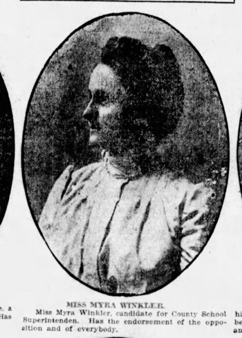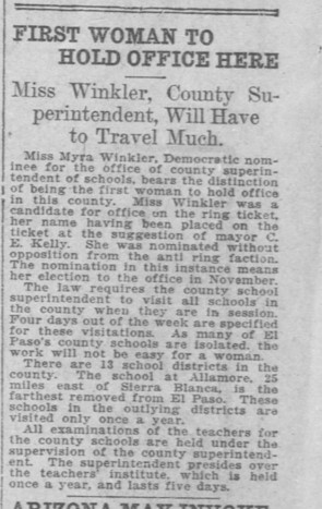 - The first woman to hold an elected office in El Paso was Myra Winkler. Winkler served for ten years as County Superintendent of Schools. She was elected unopposed in 1912 and resigned in 1922.
