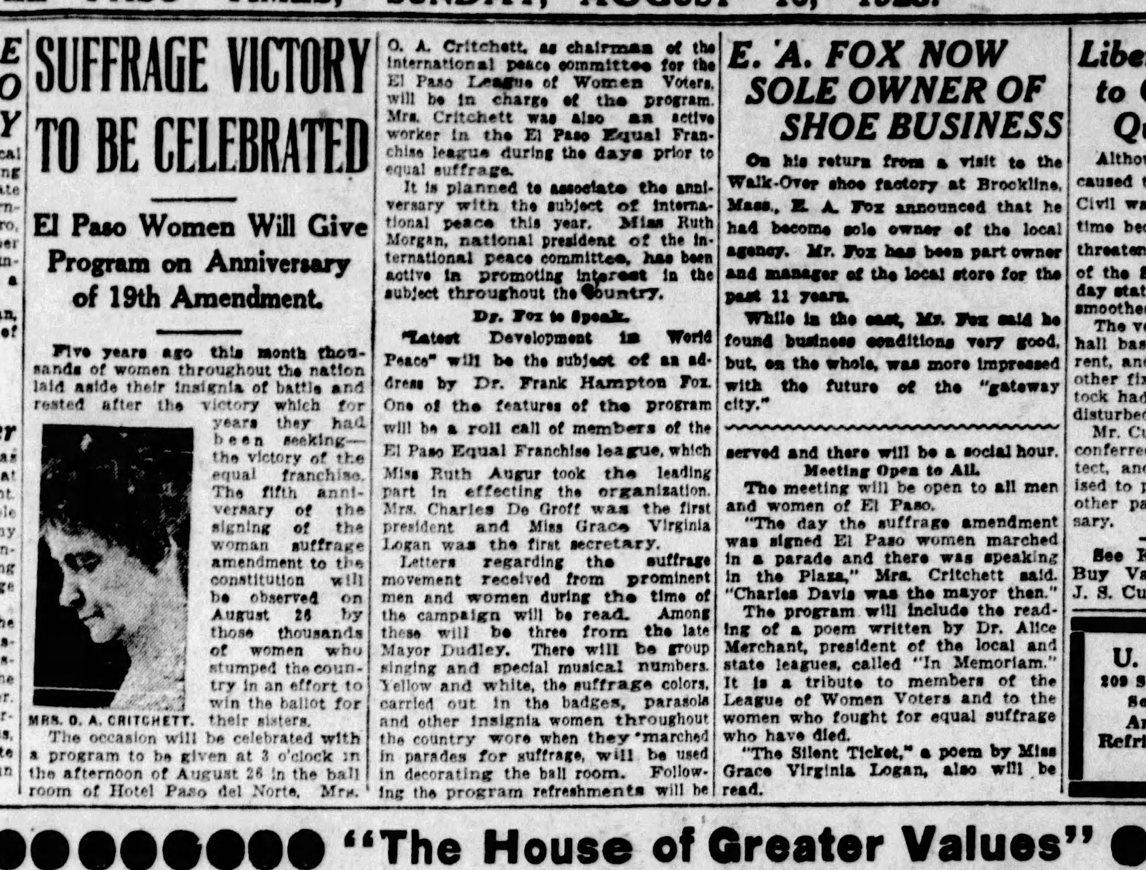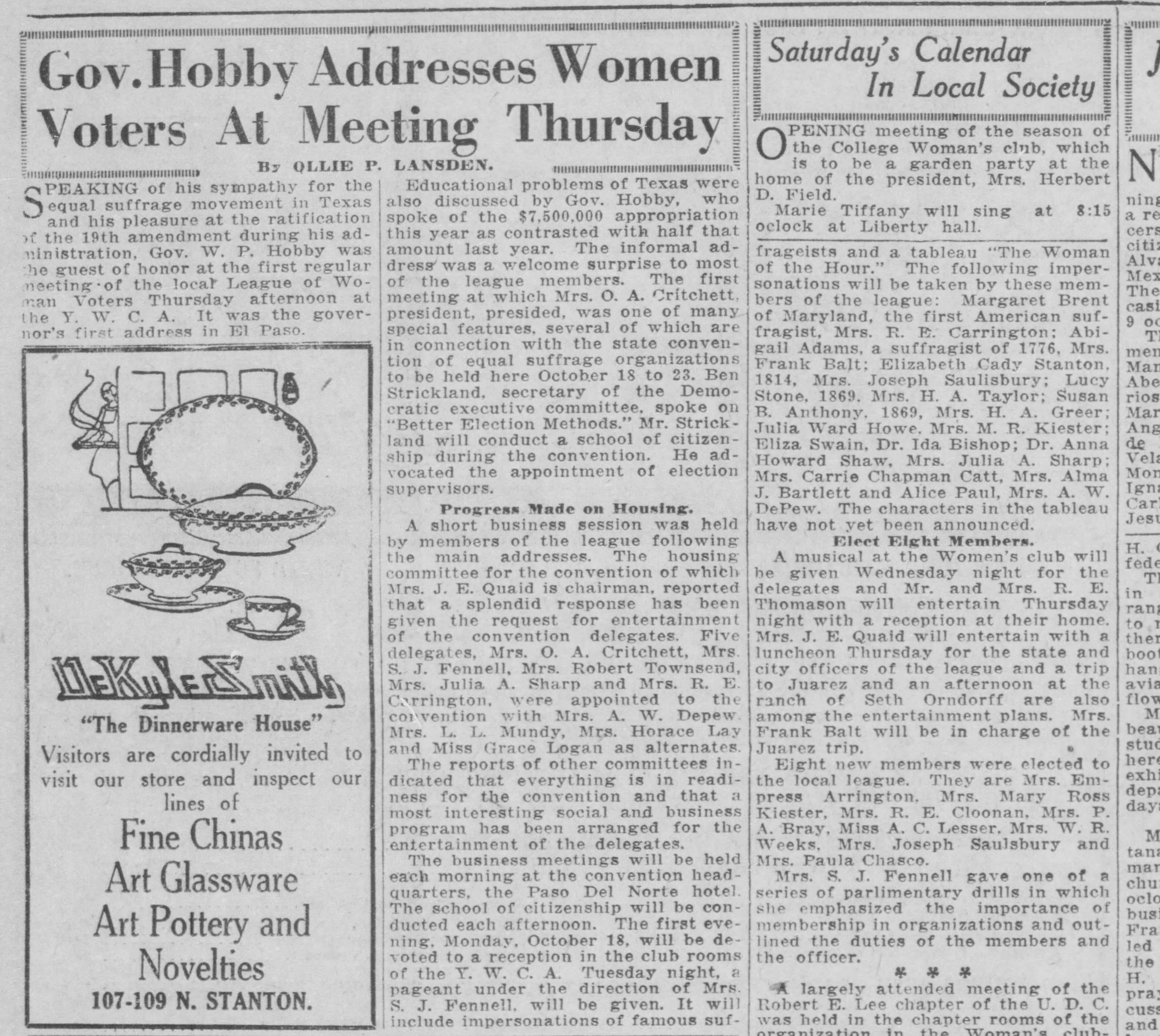 - In 1927, a local chapter of the Women Joint Legislative Council was formed by women from different El Paso women organizations to campaign for legislation that benefited women and children. Belle Critchett was chairwoman and A. Louise Dietrich was another prominent member. Nov 22, 1927 Ep Evening Post.