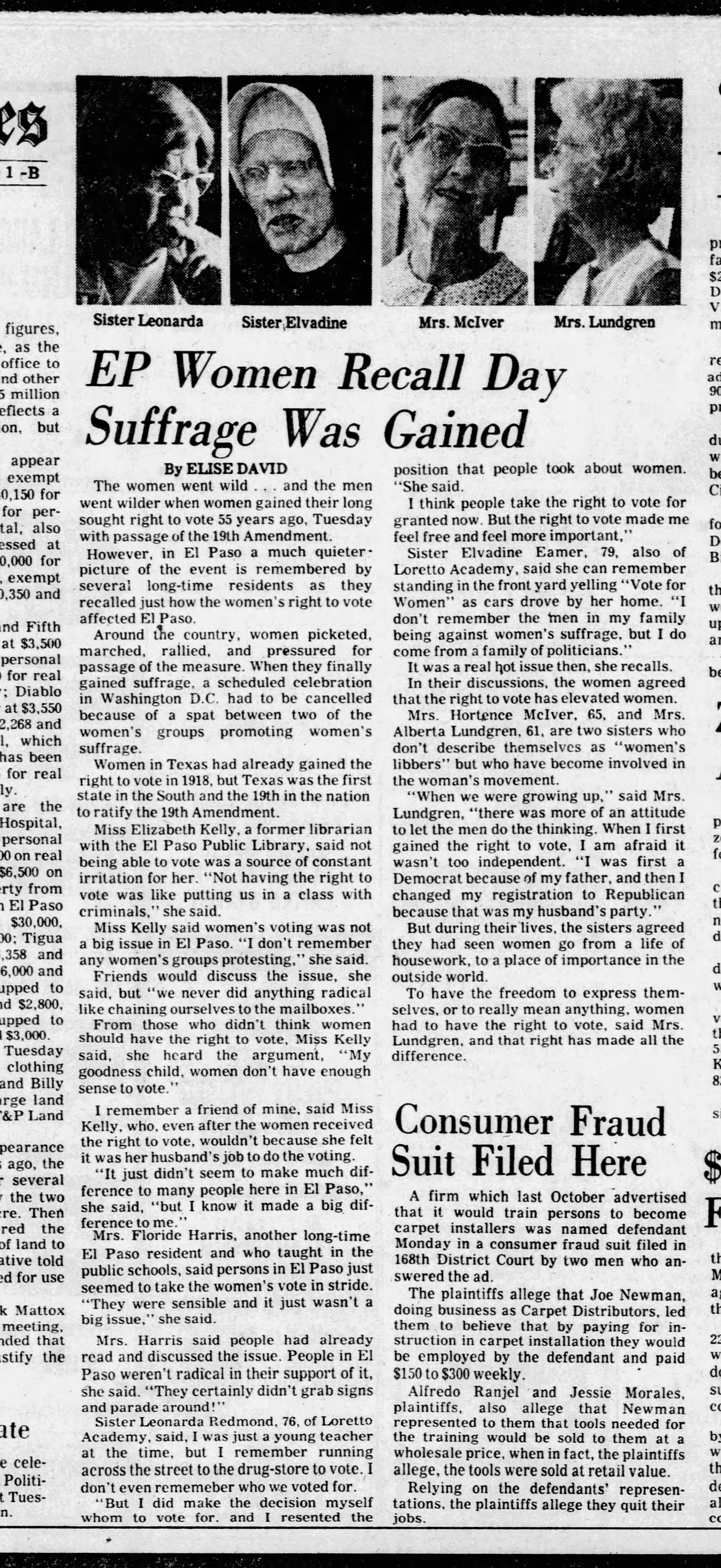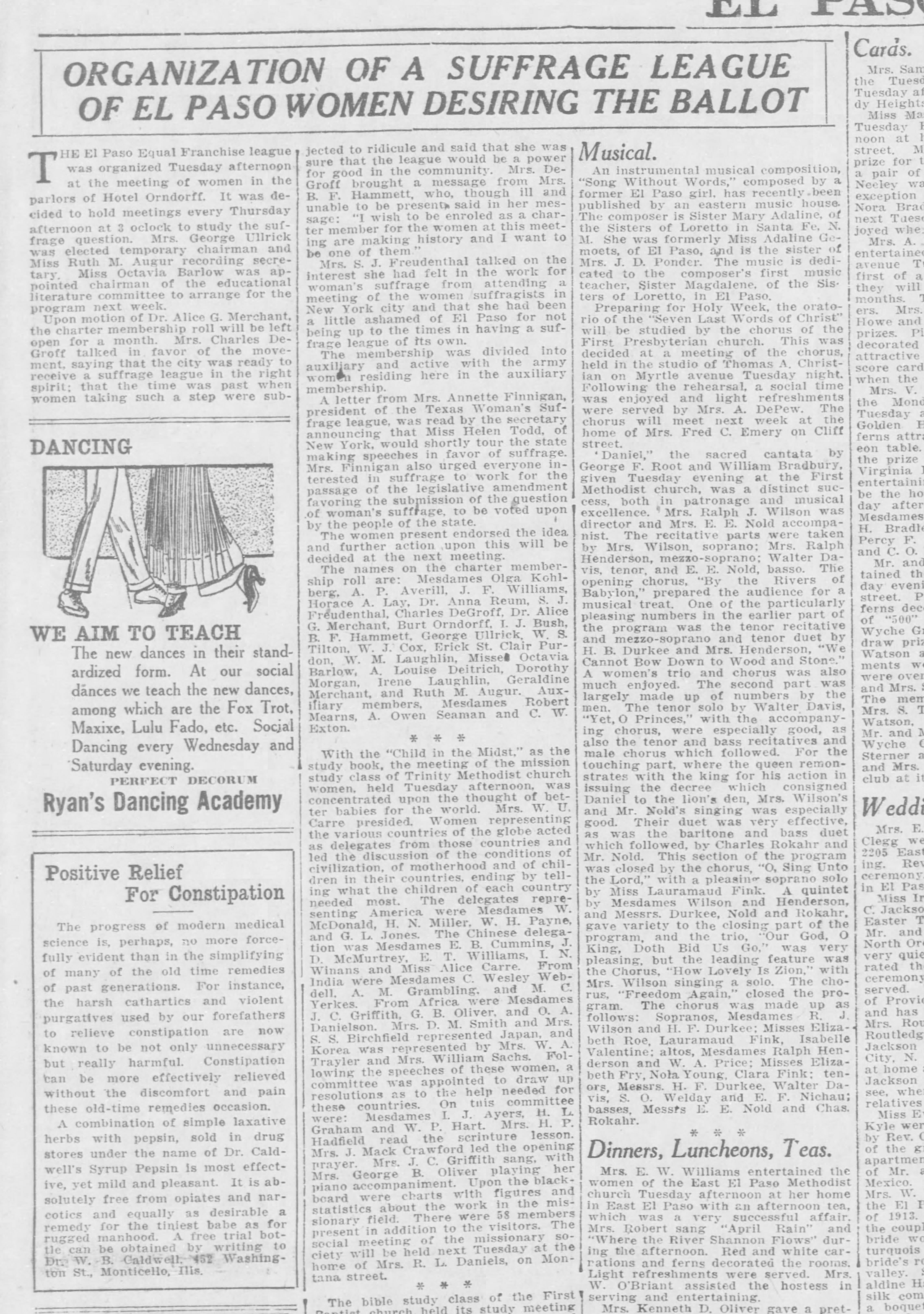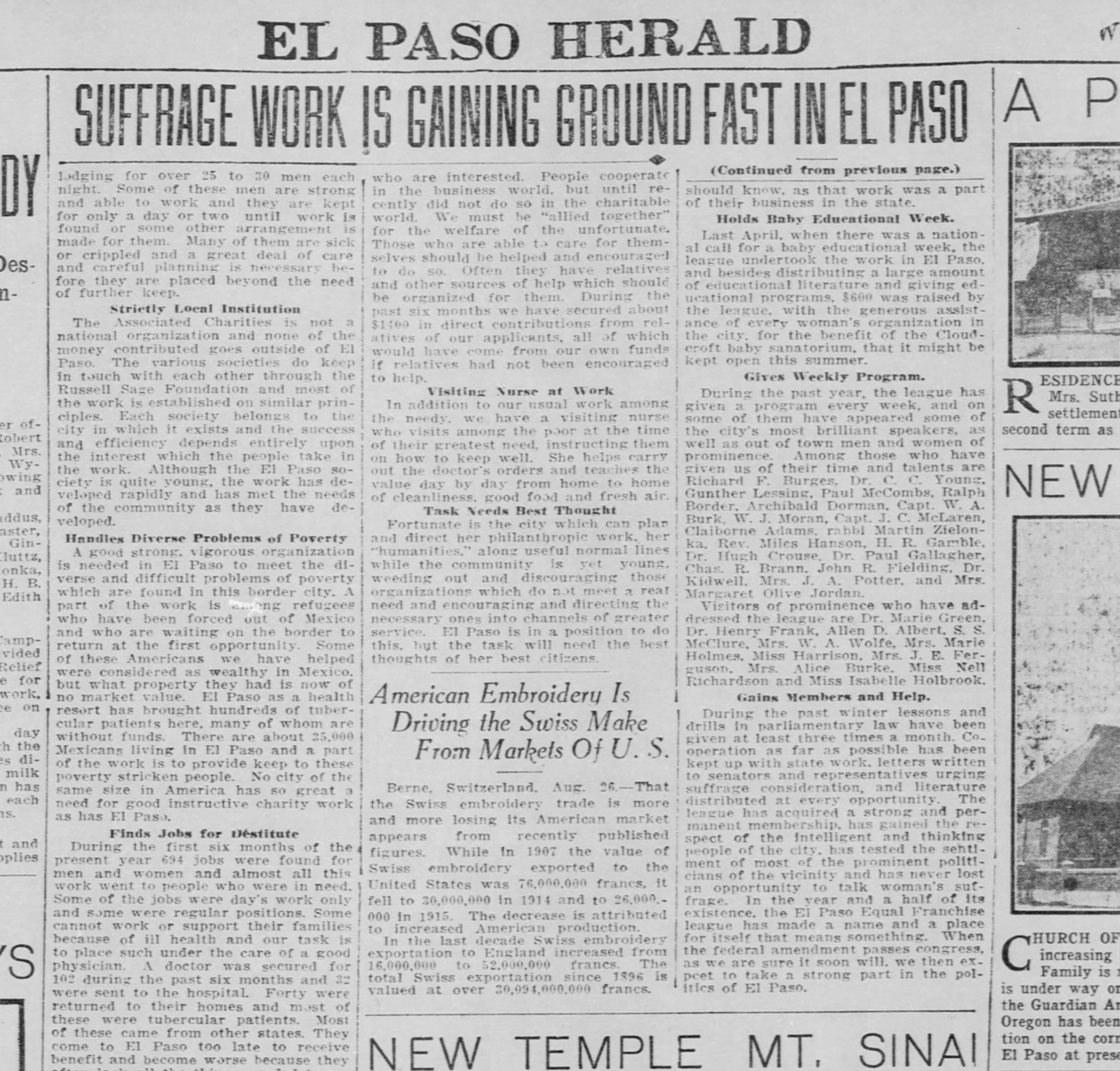 - On Jan 12, 1915, the El Paso Equal Franchise League was the first women’s suffrage organization in El Paso. It was organized at the Hotel Orndorff (now the site of Hotel Cortez). They heard different speakers, studied different issues, and helped support the Cloudcroft Baby Sanitarium. The group sought to increase public awareness of women suffrage, helped pass the 19th amendment, and helped in World War I relief work for the troops.