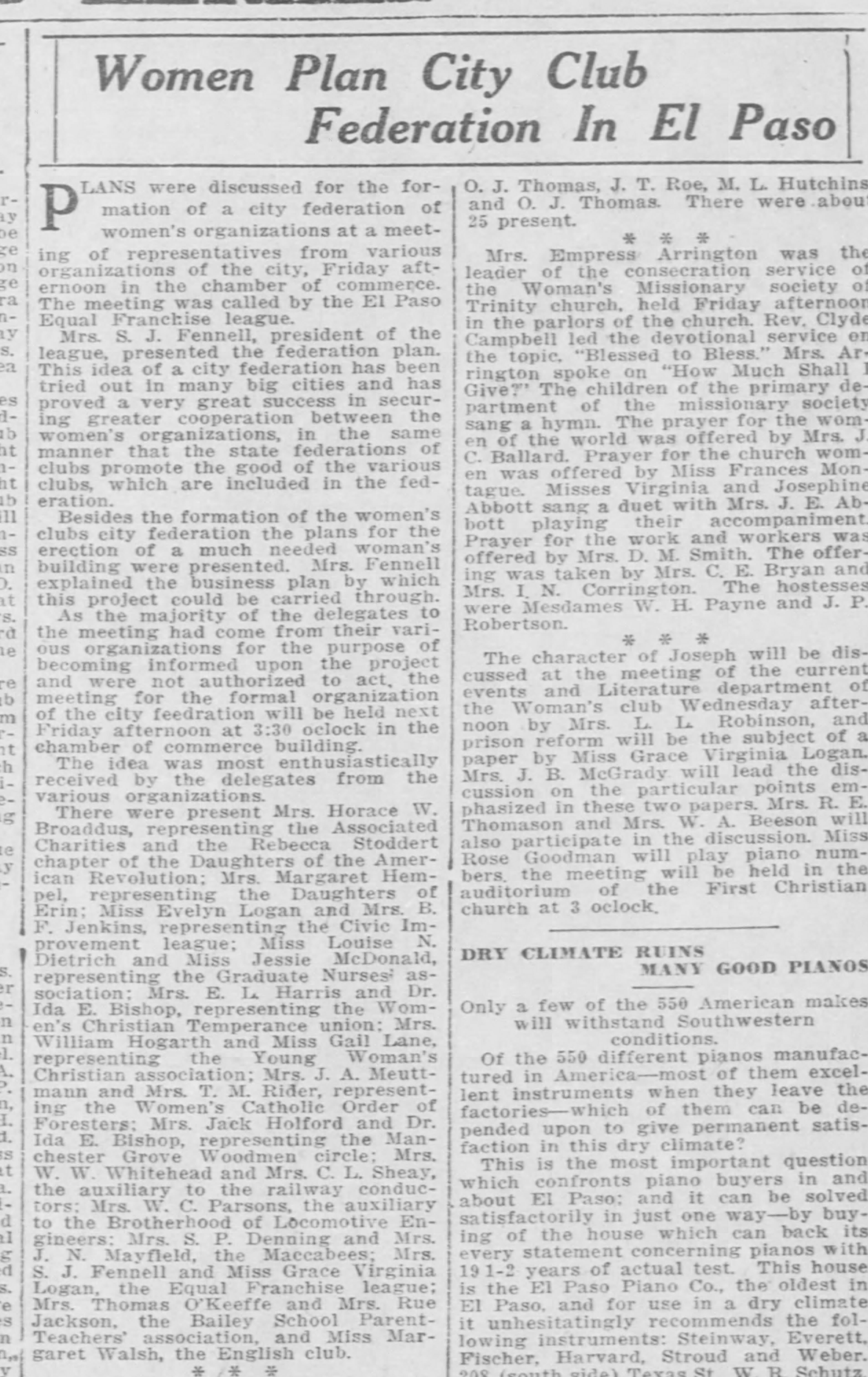 - In October of 1915, under Fannie Fennell and the El Paso Equal Franchise League’s leadership the El Paso Federation of Women’s Club was organized.