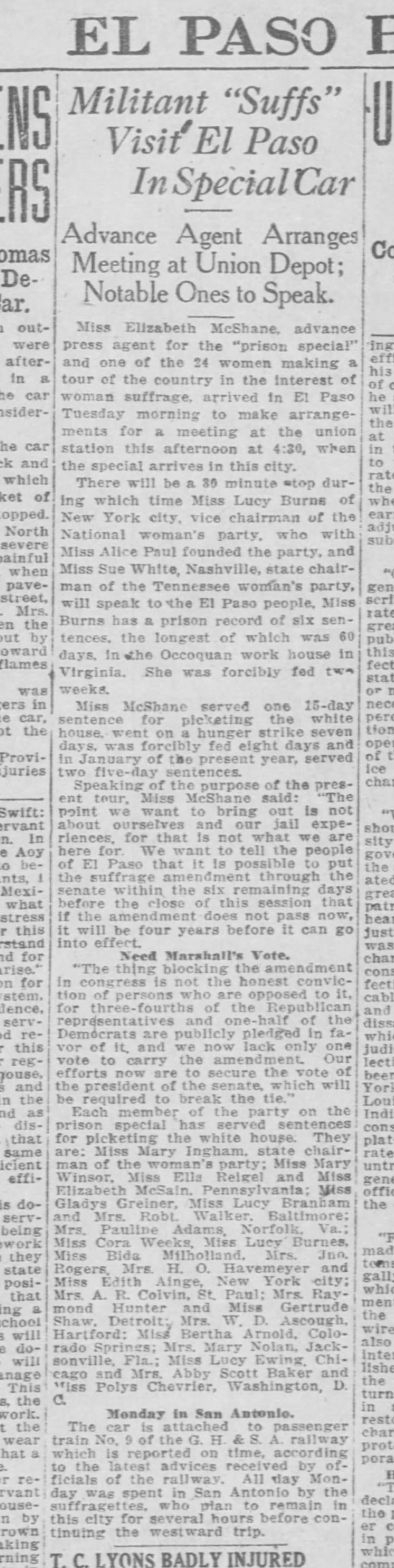 - National Women’s Party Leader, Lucy Burns came to El Paso in 1919. Feb 25, 1919 El Paso Herald