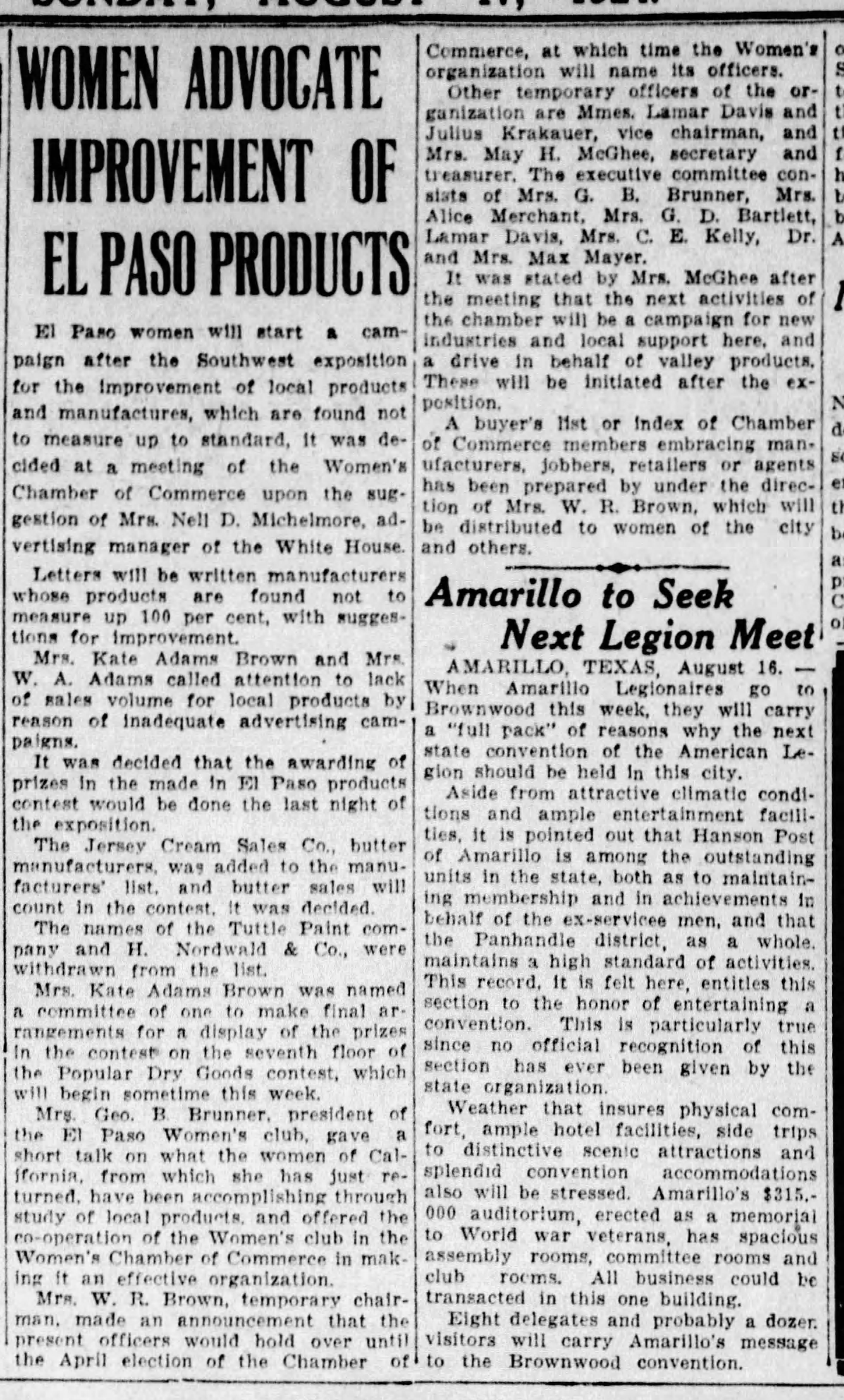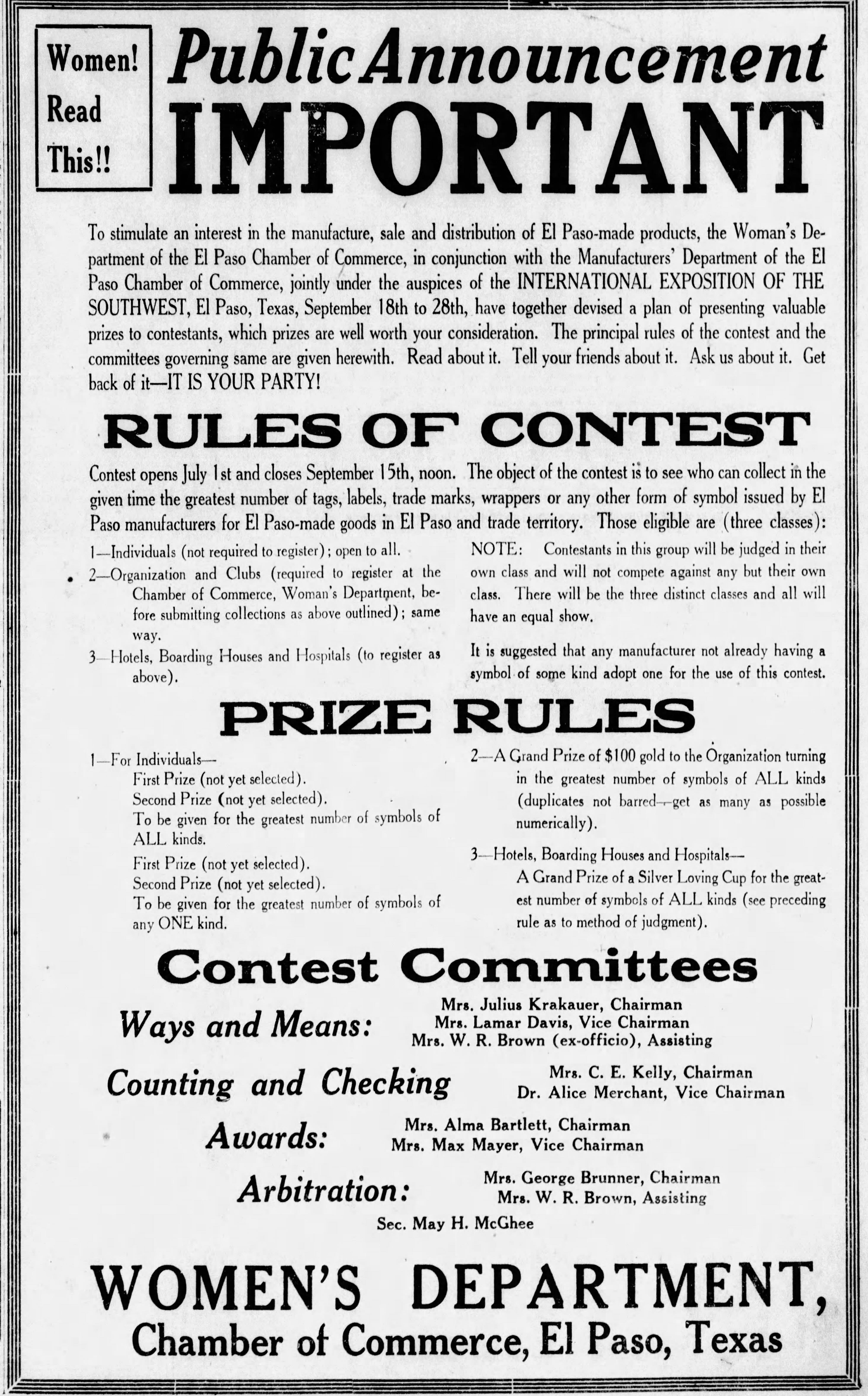 - The Women’s Department of the El Paso Chambers of Commerce was organized in 1924 by May McGhee. They led a campaign to promote El Paso and to convince local businesses to sell El Paso made products and encourage El Pasoans to buy local products. They also wrote a sightseeing booklet and worked on the beautification of city parks.