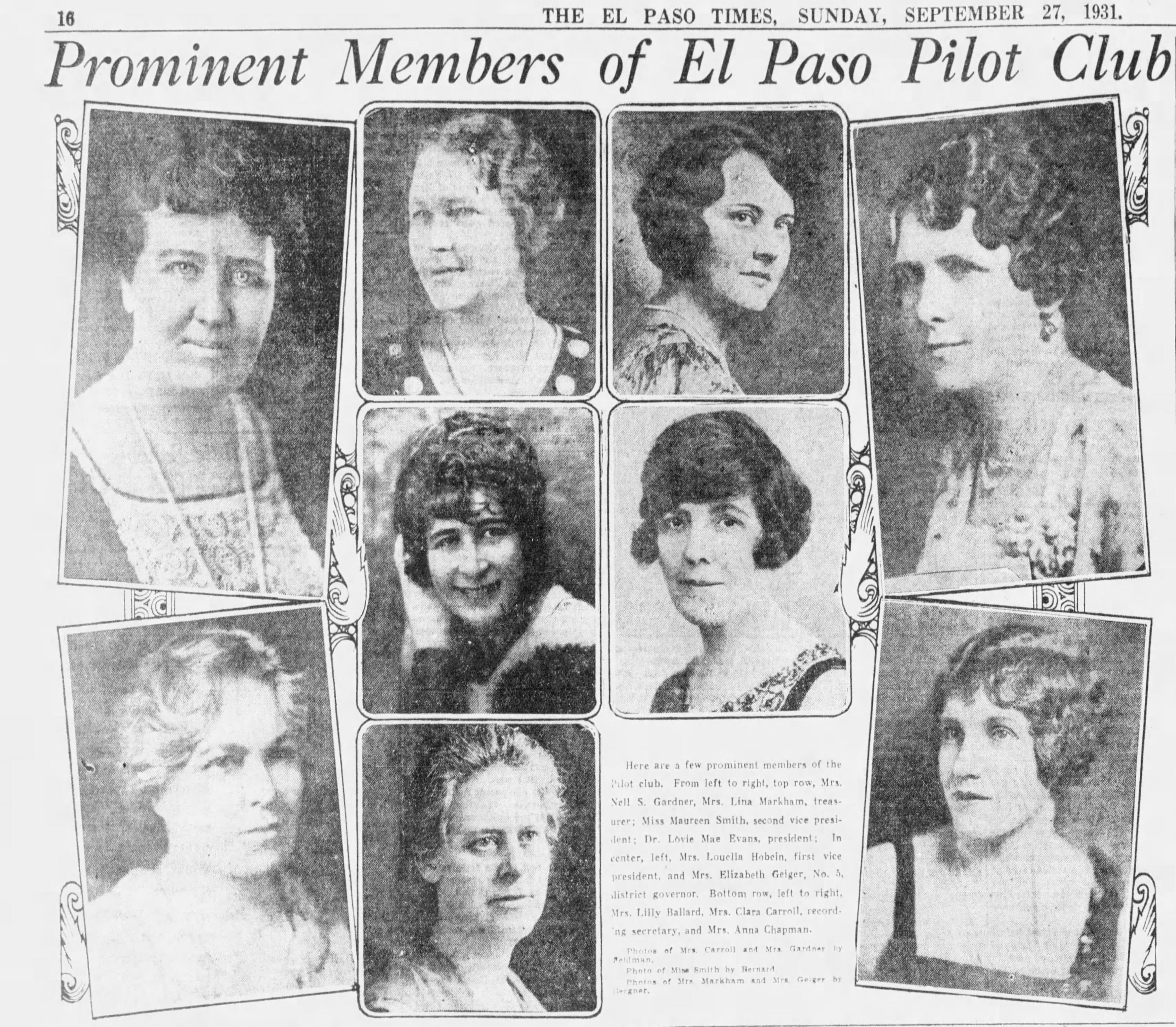 - Nell Gardner founded the first Pilot Club in El Paso. In 1937, she co-founded the Pilot Home for the elderly. In 1940, she purchased a home at 113 Edison. Gardner was the first president of Pilot International and help organized some chapters in Mexico. Gardner was honored as the First Lady of El Paso in 1960 by the Beta Sigma Phi.