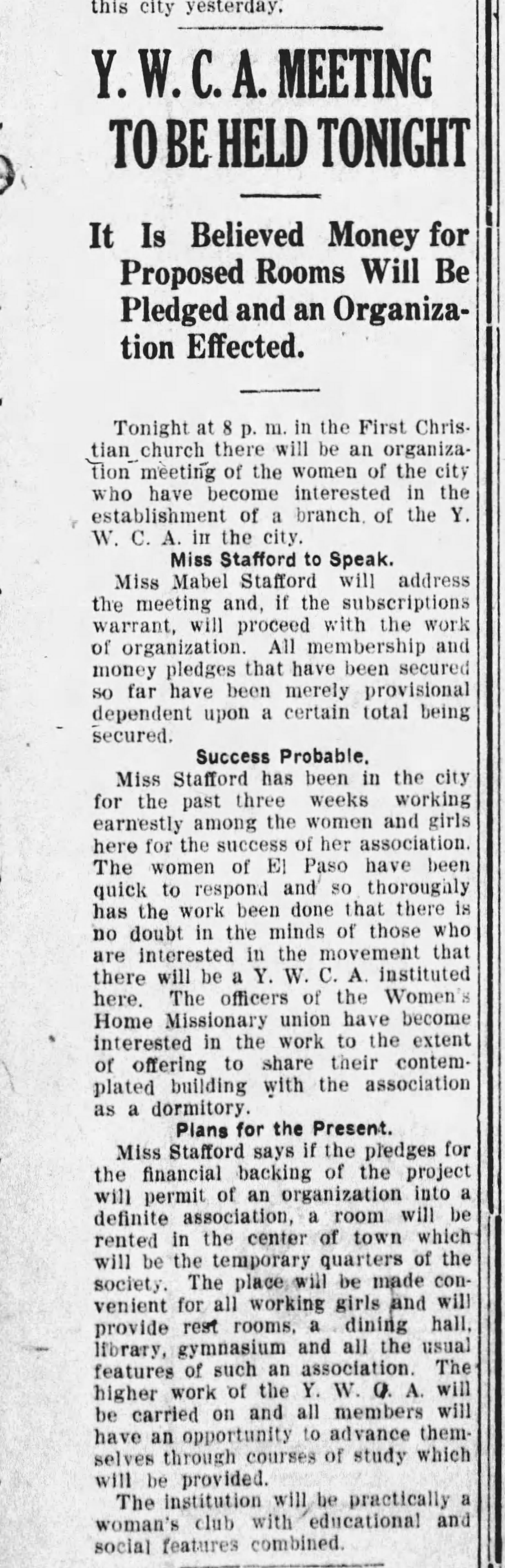 - The YW.C.A built a 52-bed residence at 541 West Missouri Street in 1910 which served as a boarding house. In 1917, they built a new building which included the first indoor swimming pool in El Paso at 215 East Franklin Street.