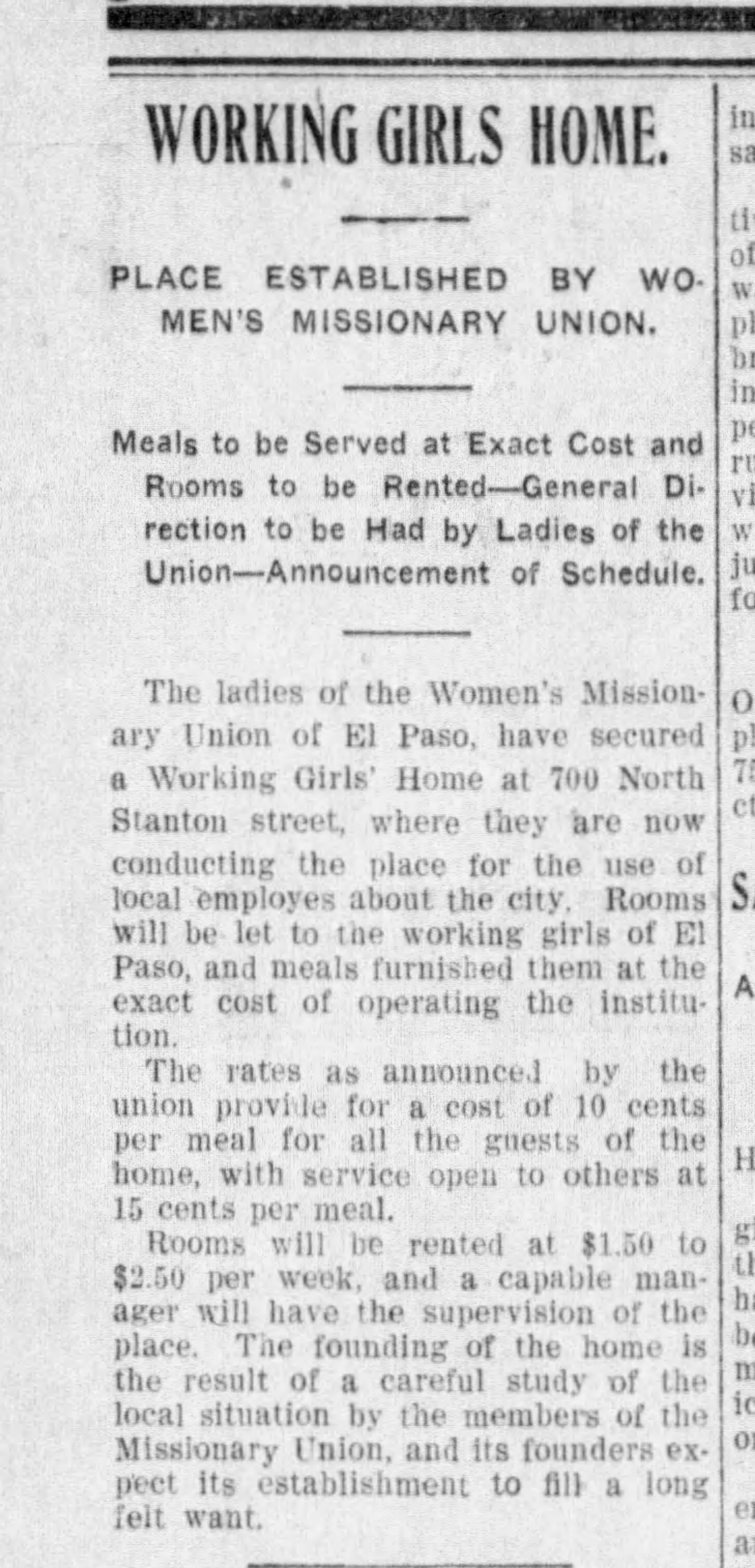 - In 1908, the Women Missionary Union wanted to build a new home. They started raising money and acquired land. In 1909, they turned over two lots on Missouri Street, furnishings and mining stock to the newly formed Young Women’s Christian Association.